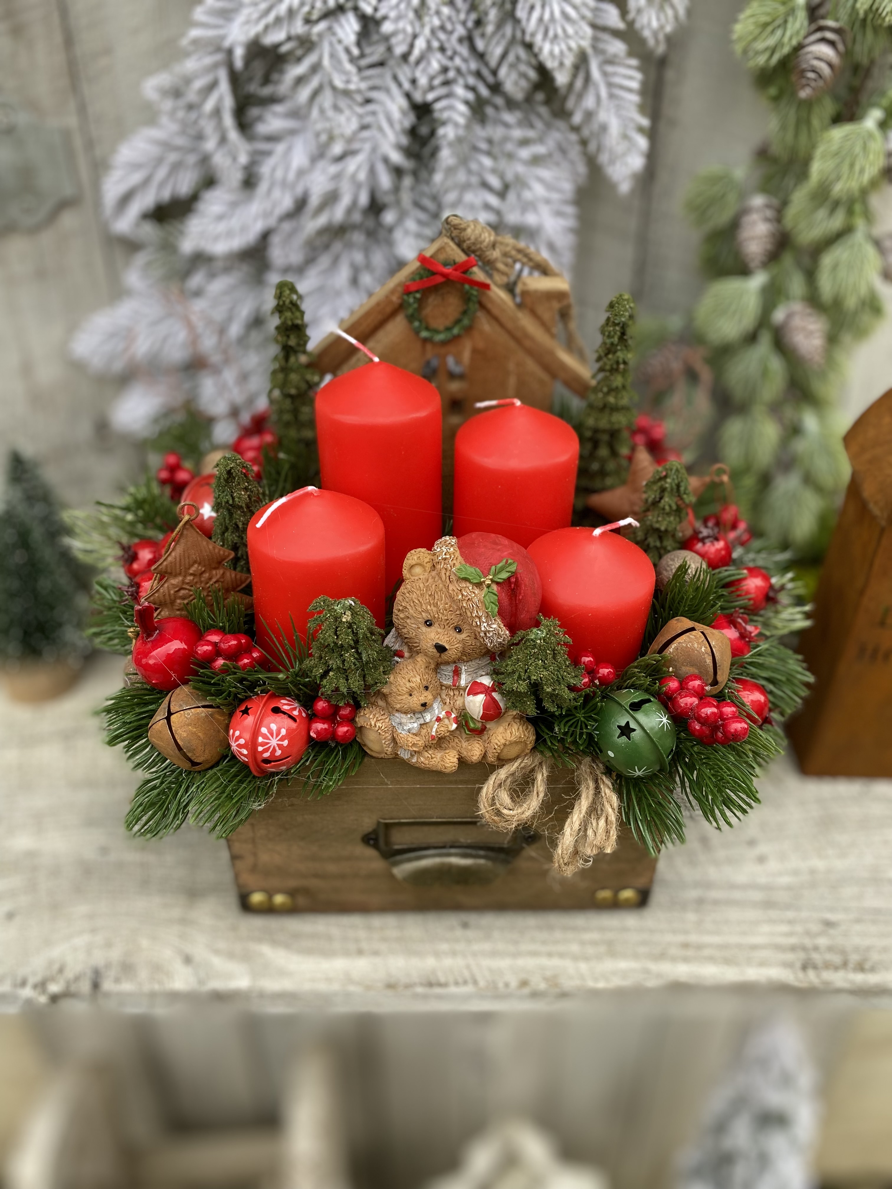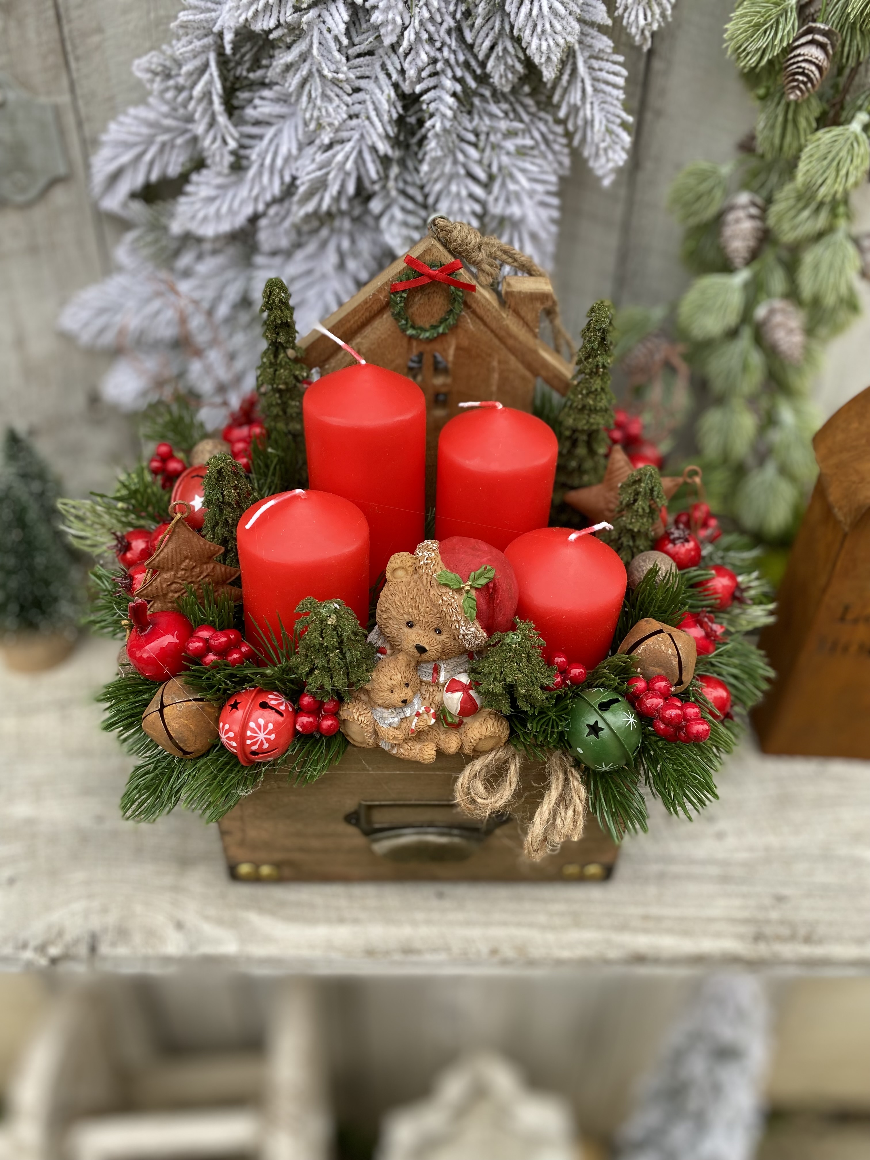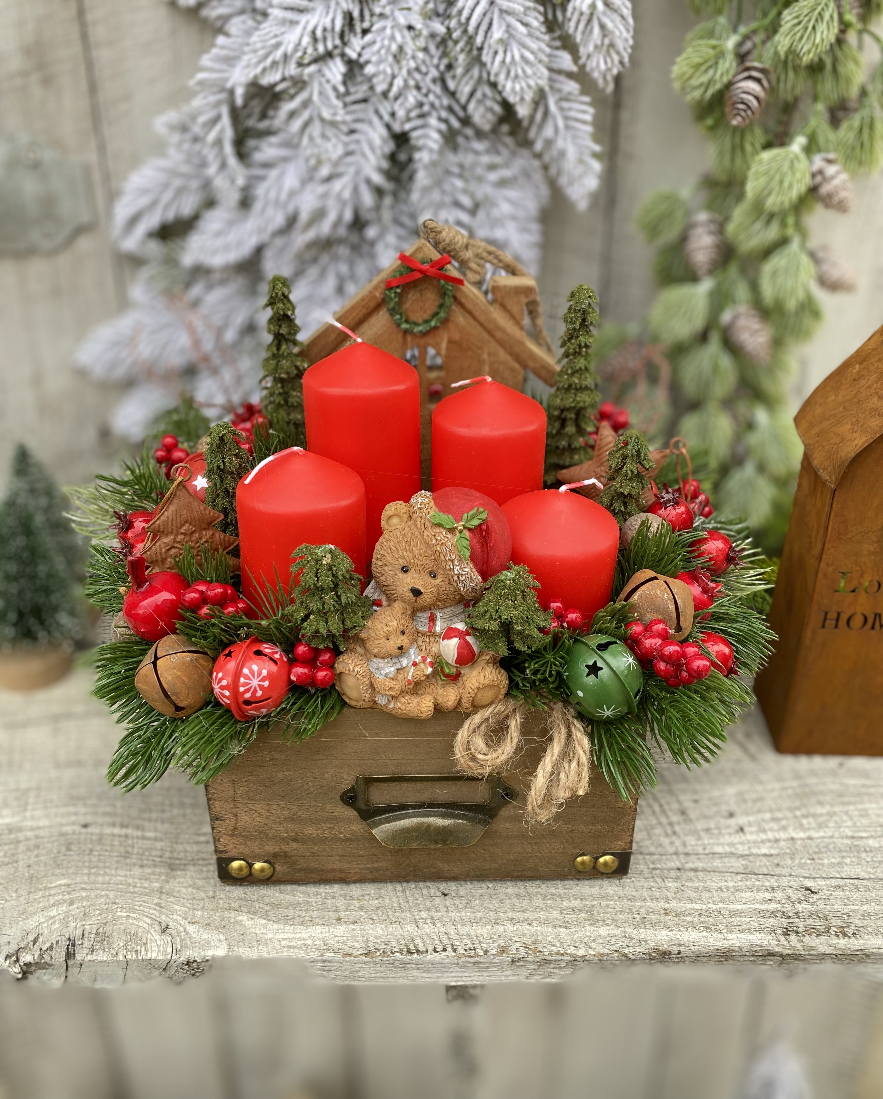 Adventný svietnik s domčekom, macko, stromčeky a iné doplnky v šuflíčku. Súčasťou sú aj sviečky na bodcoch. Nenechávajte horieť bez dozoru! Šírka je 28cm.
