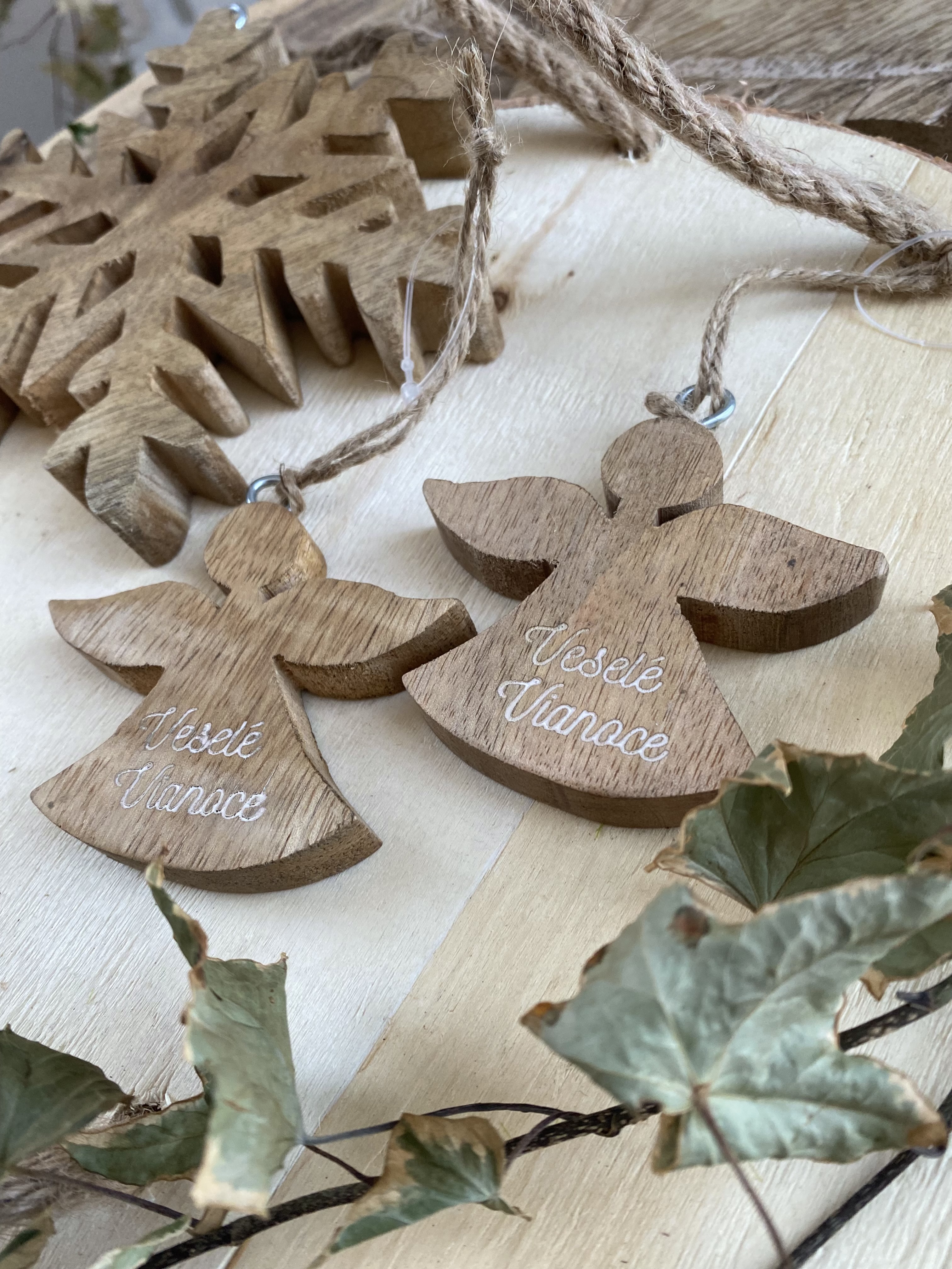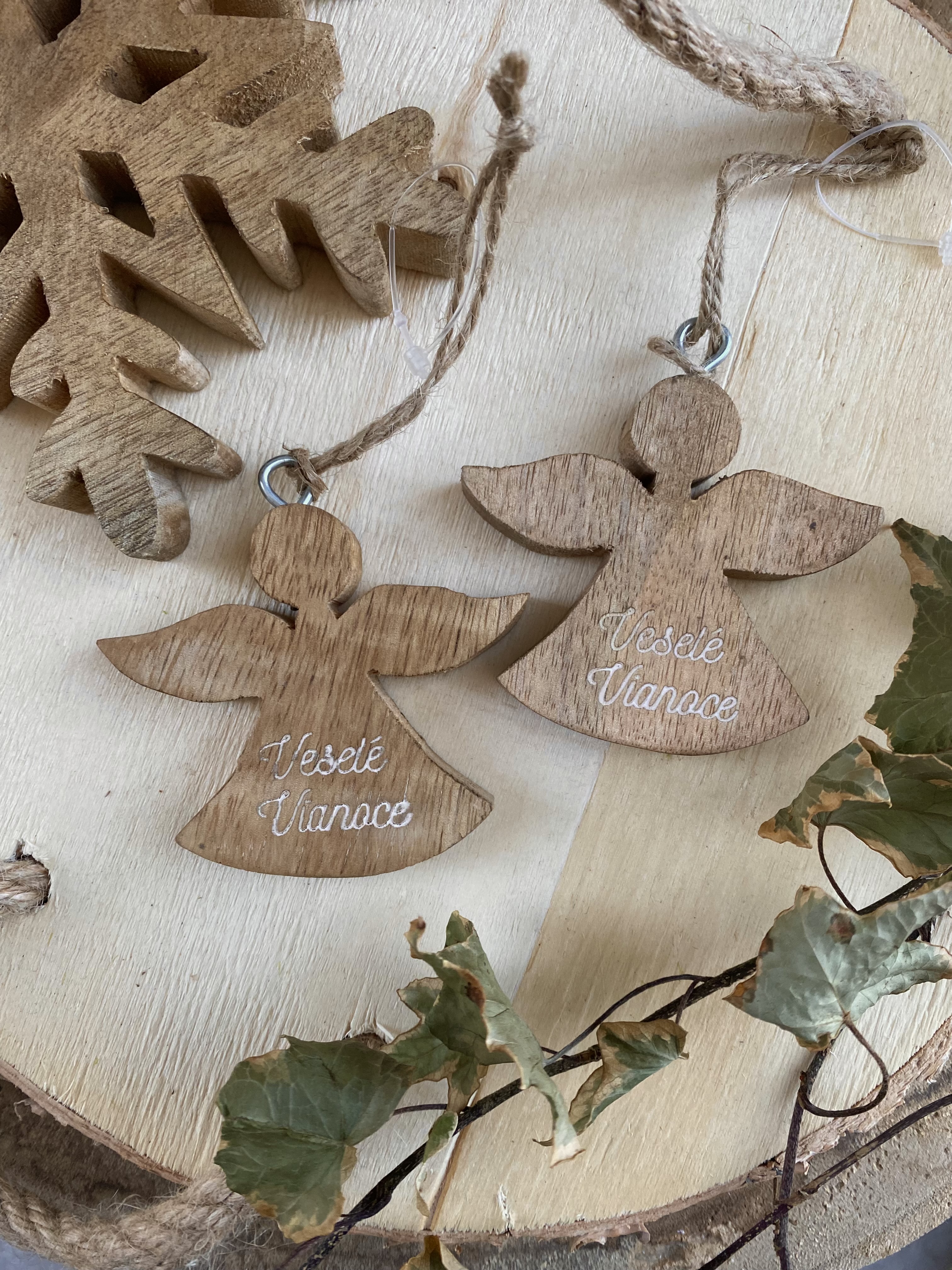 anjelik na zavesenie s nápisom Veselé Vianoce, mangové drevo