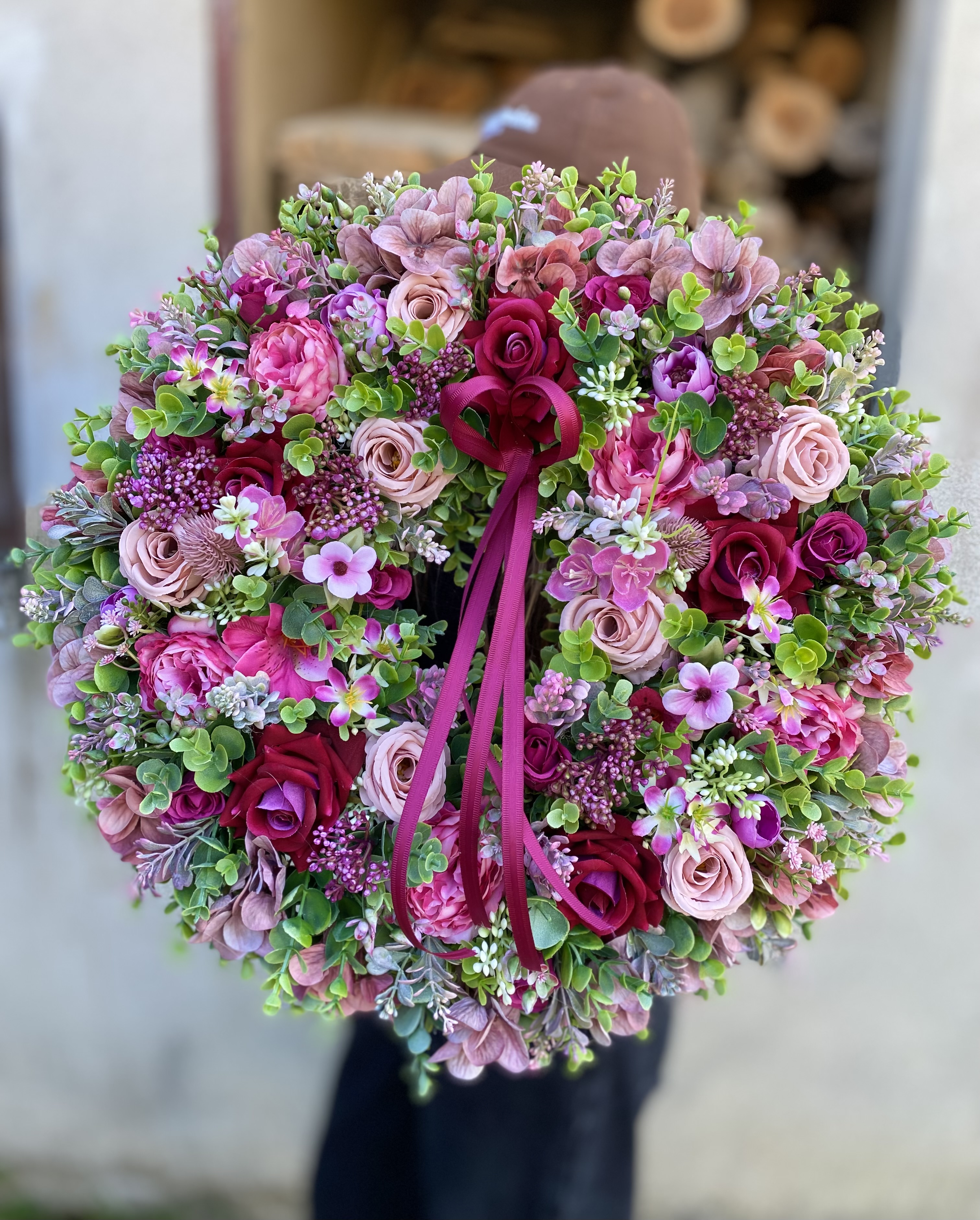 Celoročný veniec s priemerom cca 46cm.Použitý umelý materiál, stuha. Vzadu je putko na zavesenie.