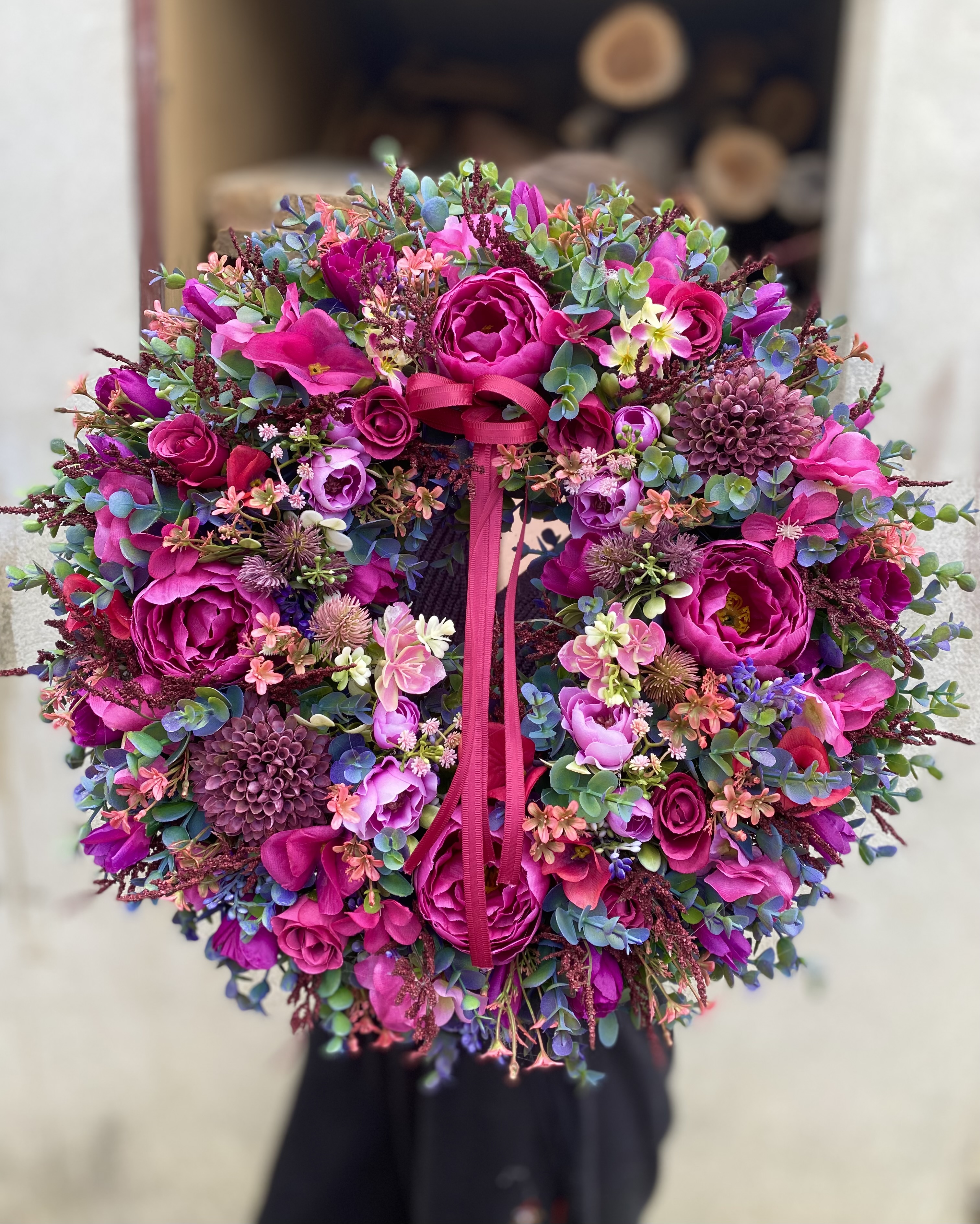 Celoročný veniec s priemerom cca 45cm.Použitý umelý materiál, stuha. Vzadu je putko na zavesenie.