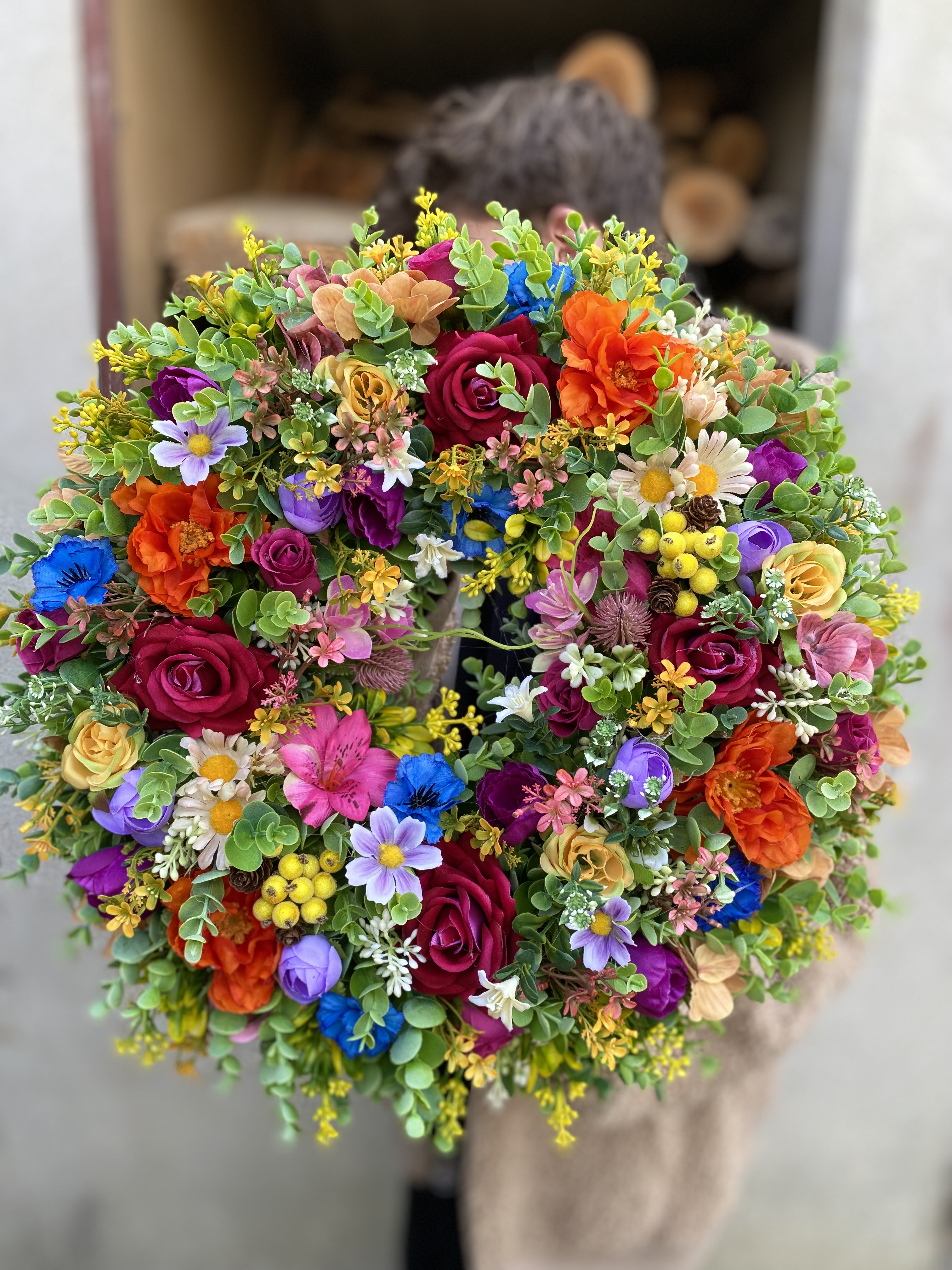 Celoročný veniec s priemerom cca 45cm.Použitý umelý materiál.