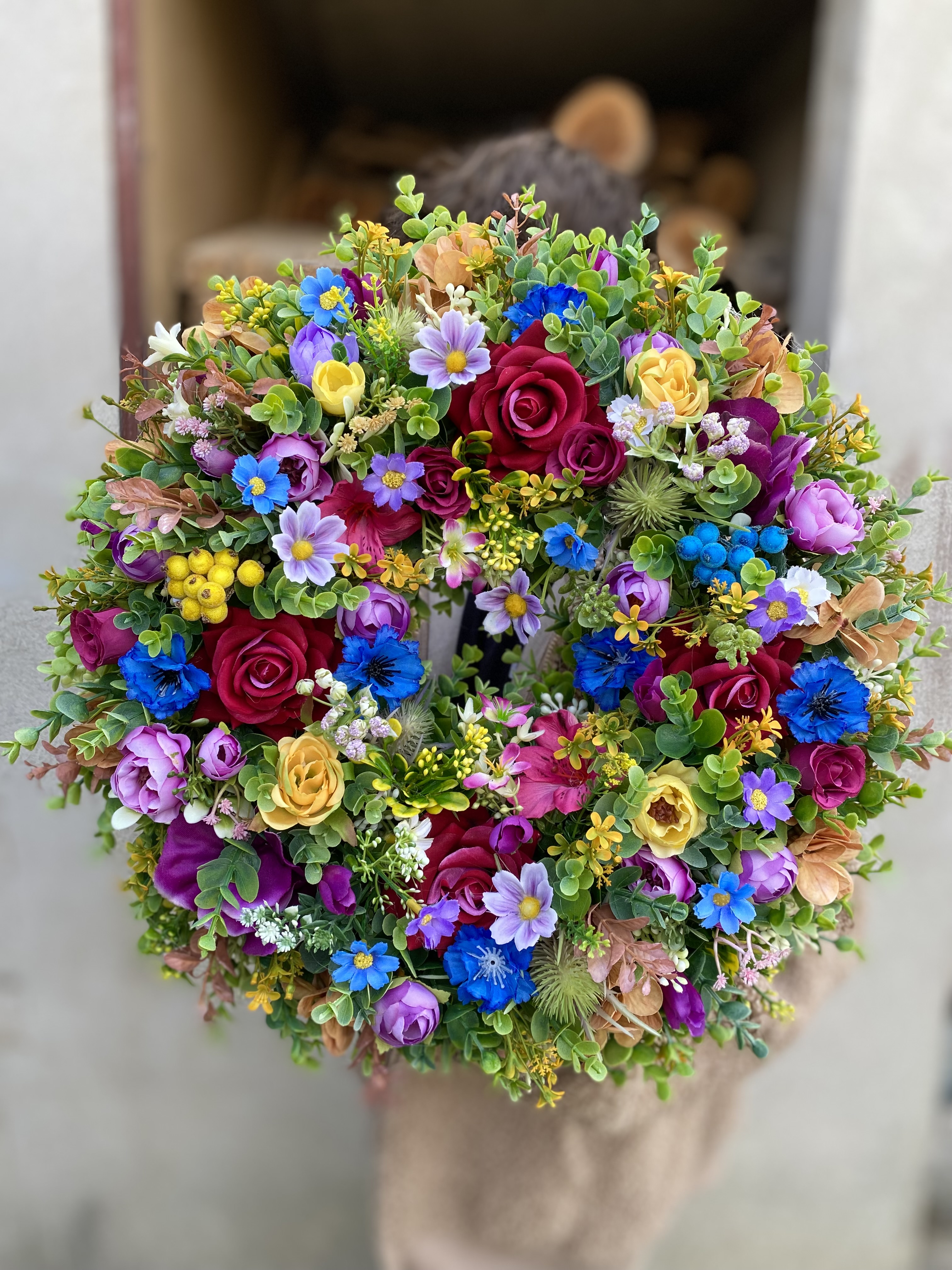 Celoročný veniec s priemerom cca 45cm. Použitý umelý materiál.