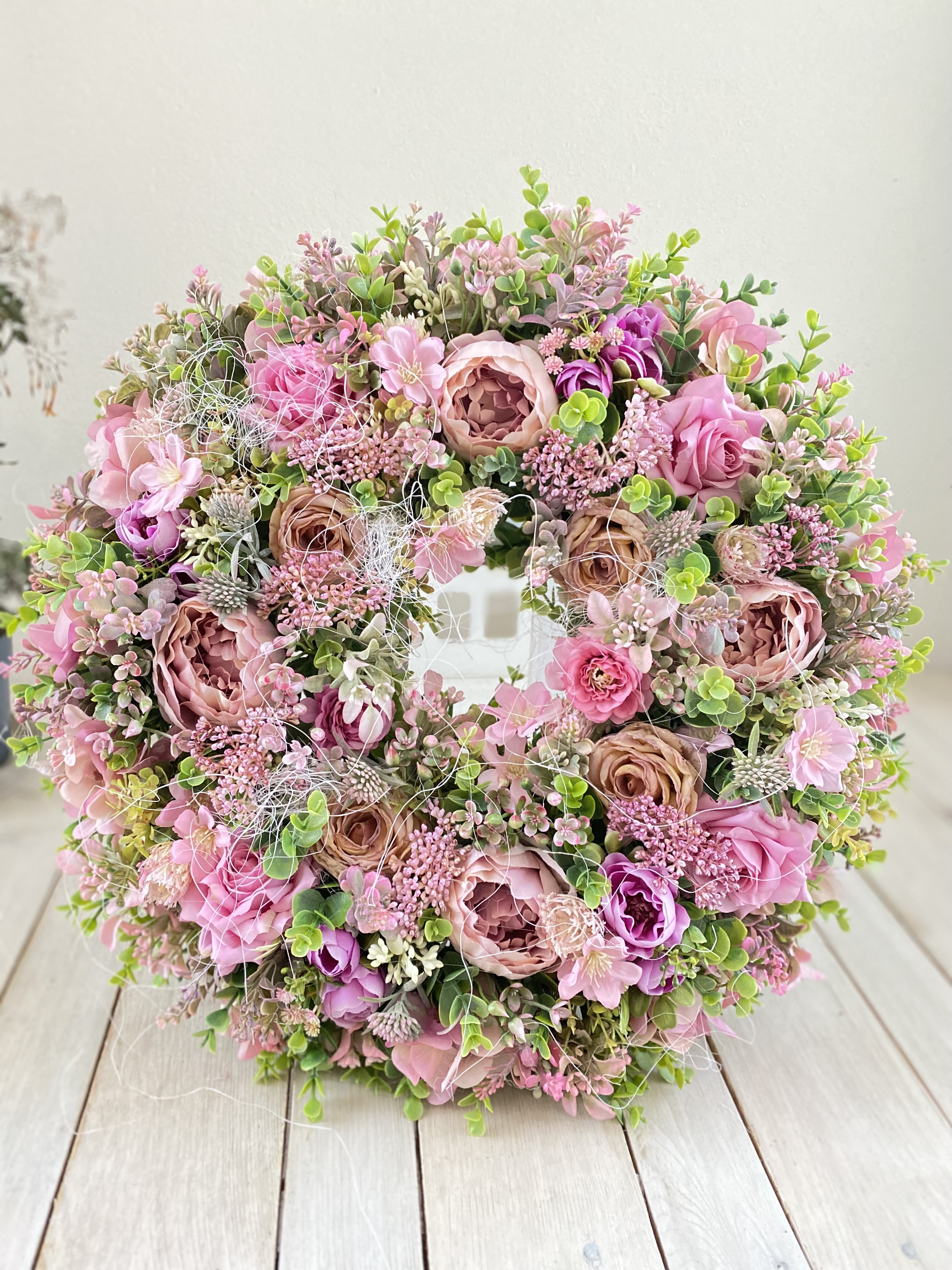 Celoročný veniec s priemerom cca 45cm.Použitý umelý materiál.