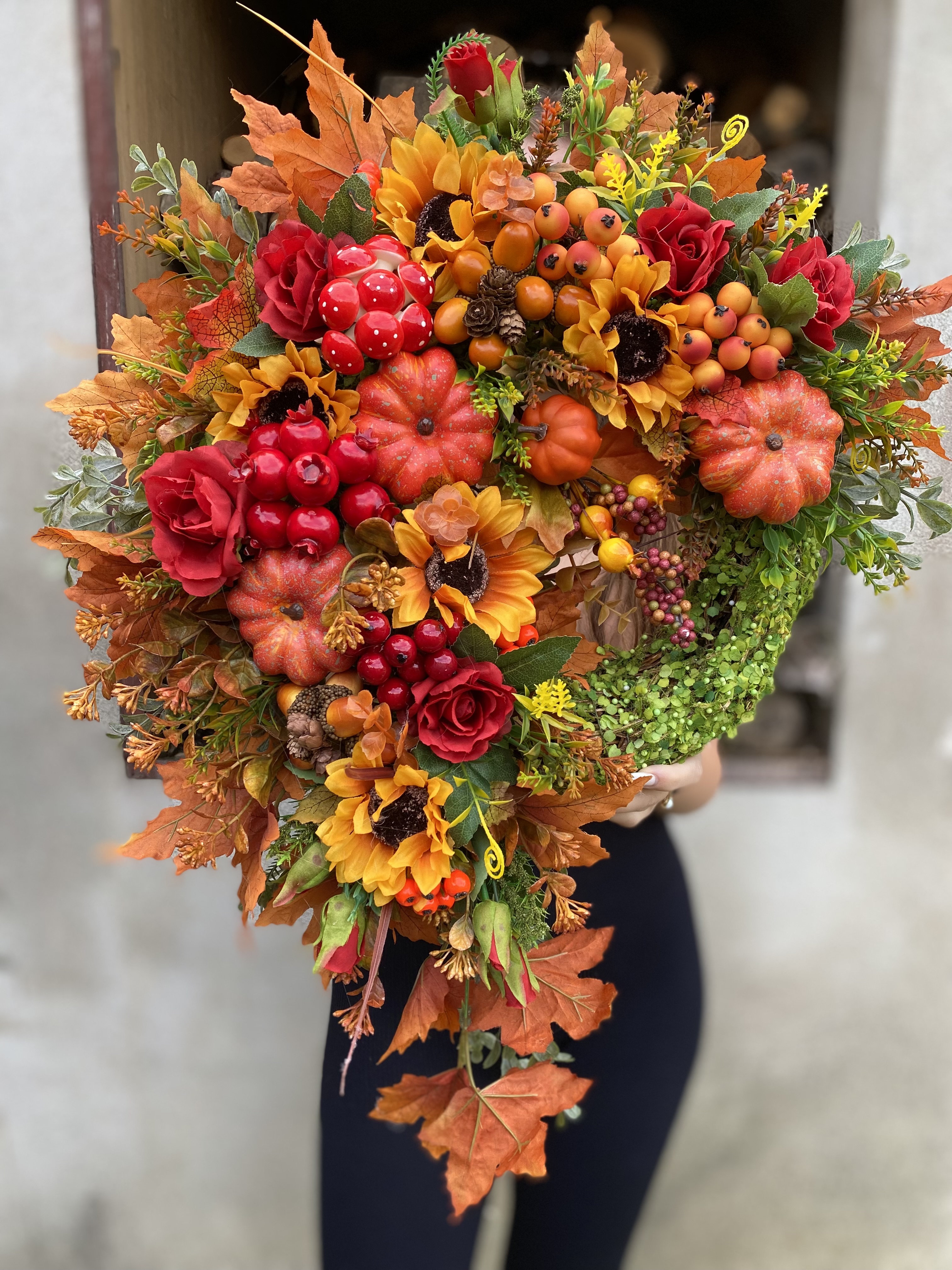 Jesenný veniec s priemerom cca 43cm previs 50cm. Použitý umelý materiál,prútie.