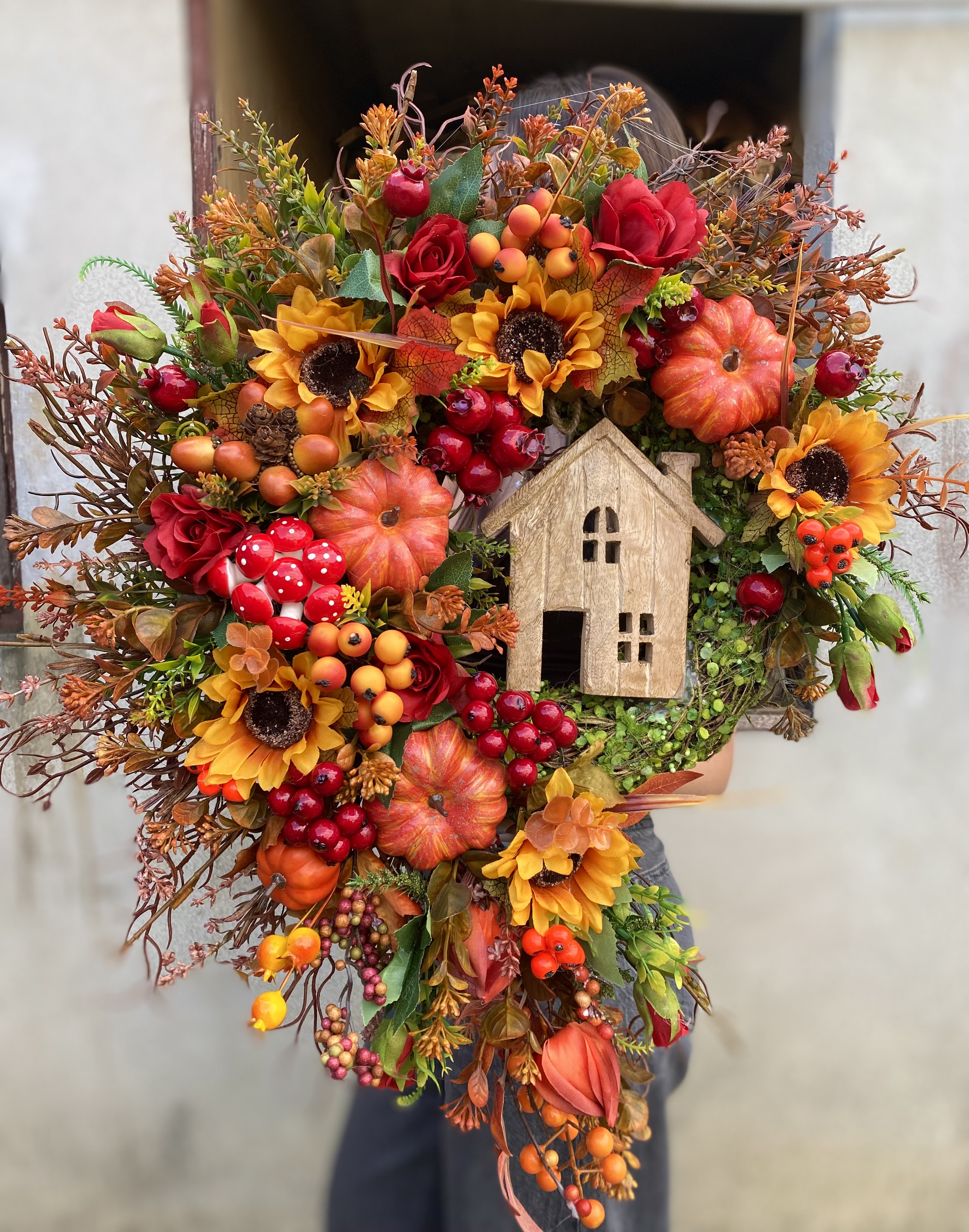 Tento originálny jesenný veniec s domčekom v sebe spája teplo domova a čaro jesennej prírody. Ručne aranžovaný veniec je ozdobený prvkami v odtieňoch jesene - plody,lístie, kvety, dekoratívny domček, ktorý symbolizuje pohodu a útulnosť.