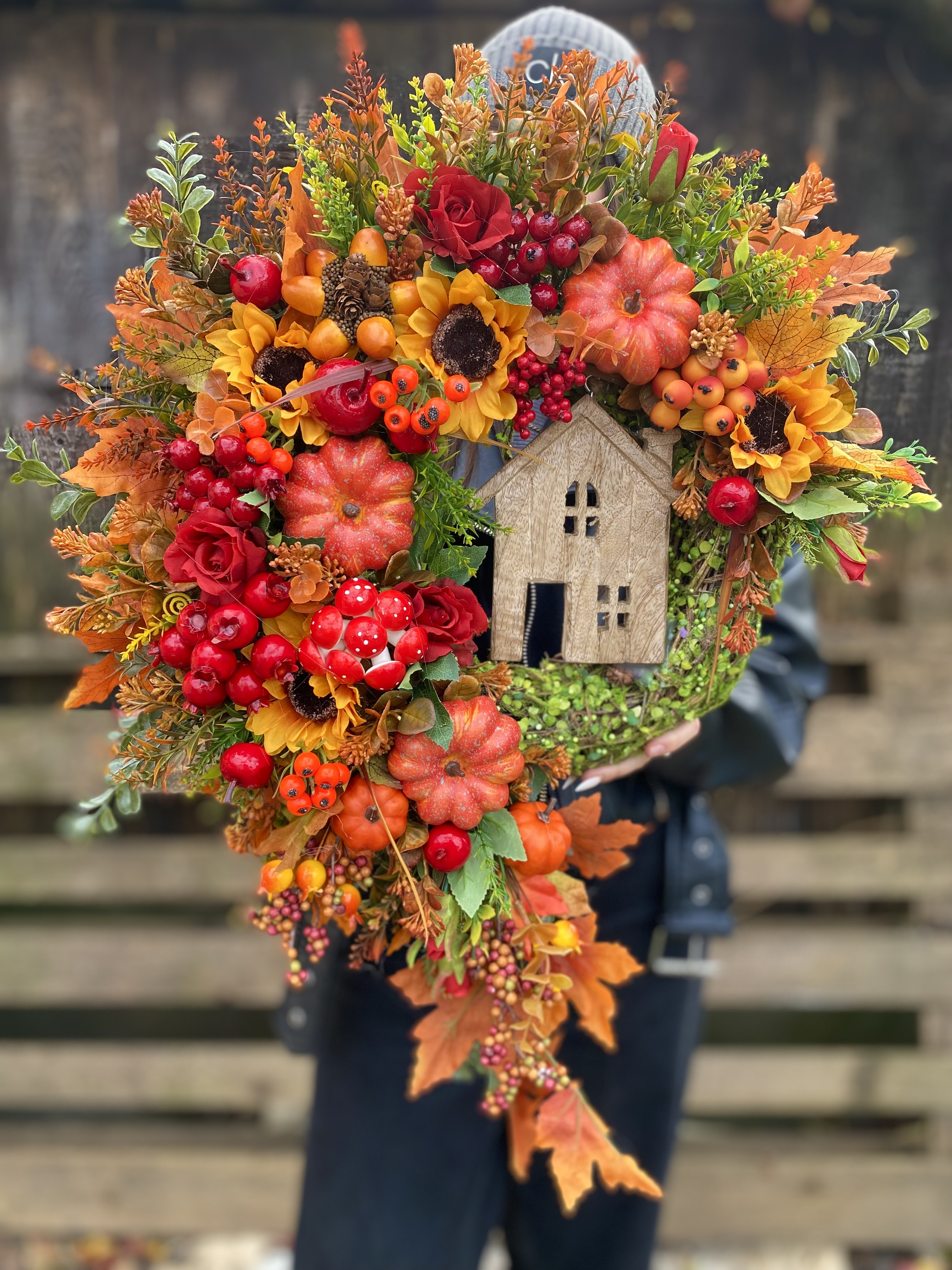 Tento originálny jesenný veniec s domčekom v sebe spája teplo domova a čaro jesennej prírody. Ručne aranžovaný veniec je ozdobený prvkami v odtieňoch jesene - plody,lístie, kvety, dekoratívny domček, ktorý symbolizuje pohodu a útulnosť.