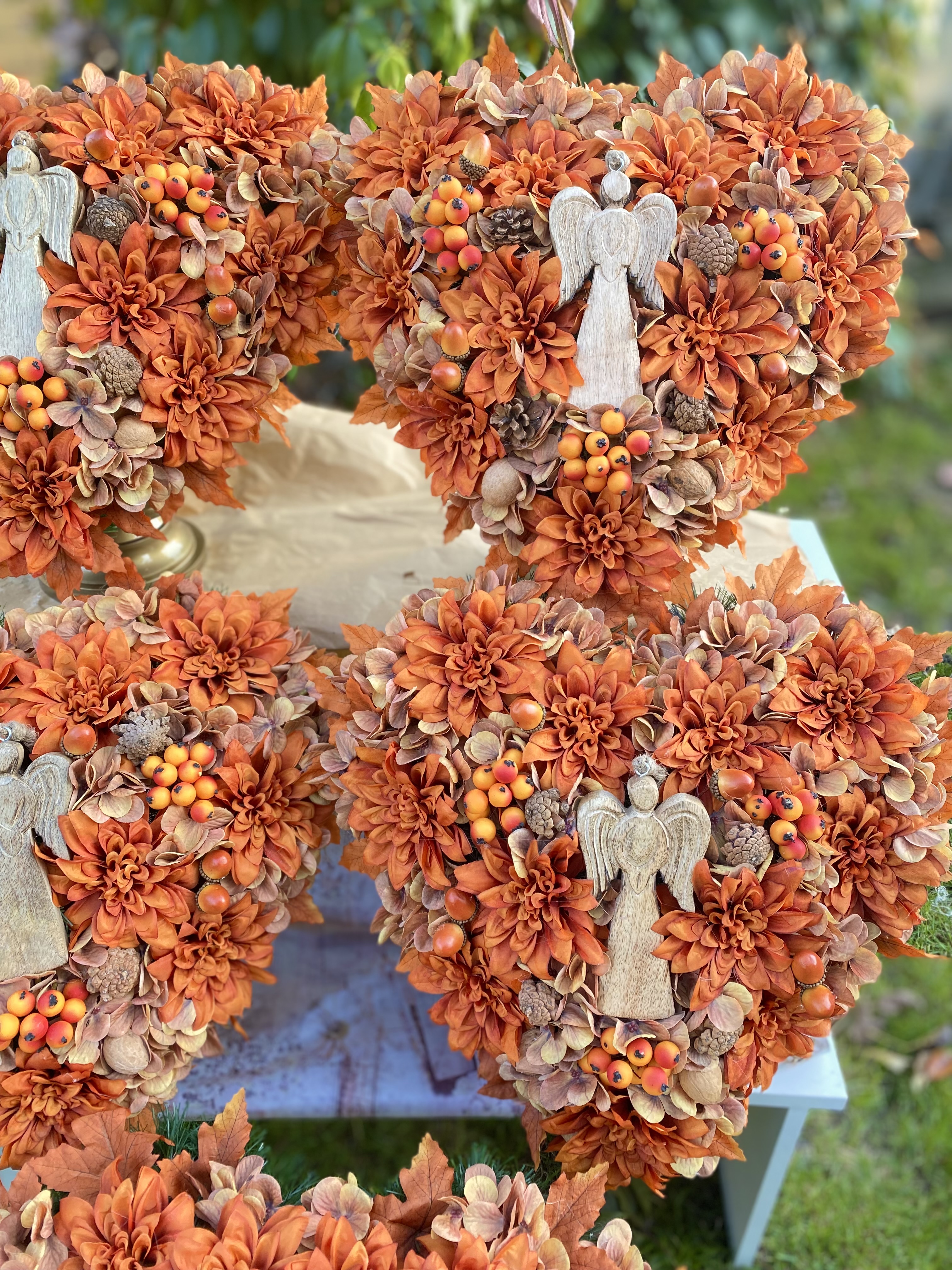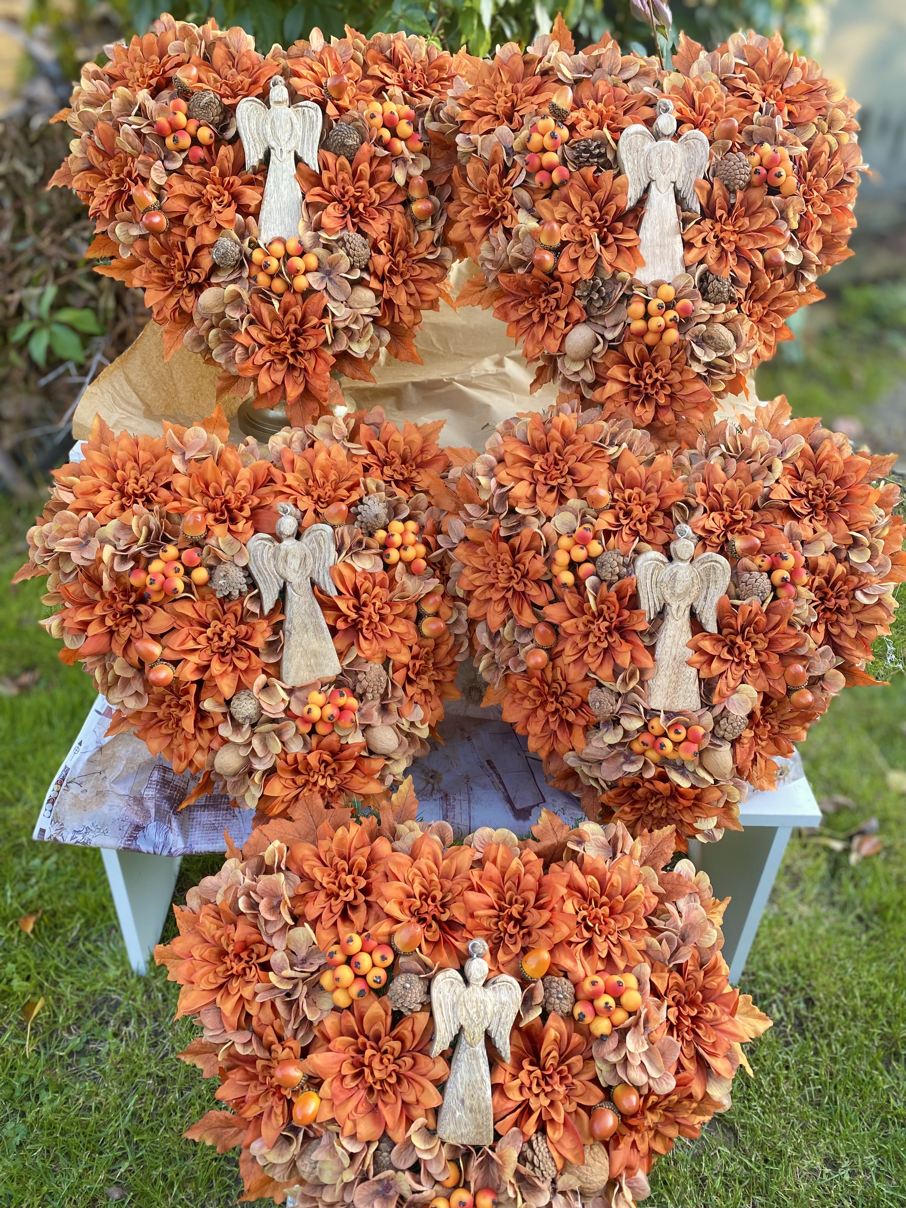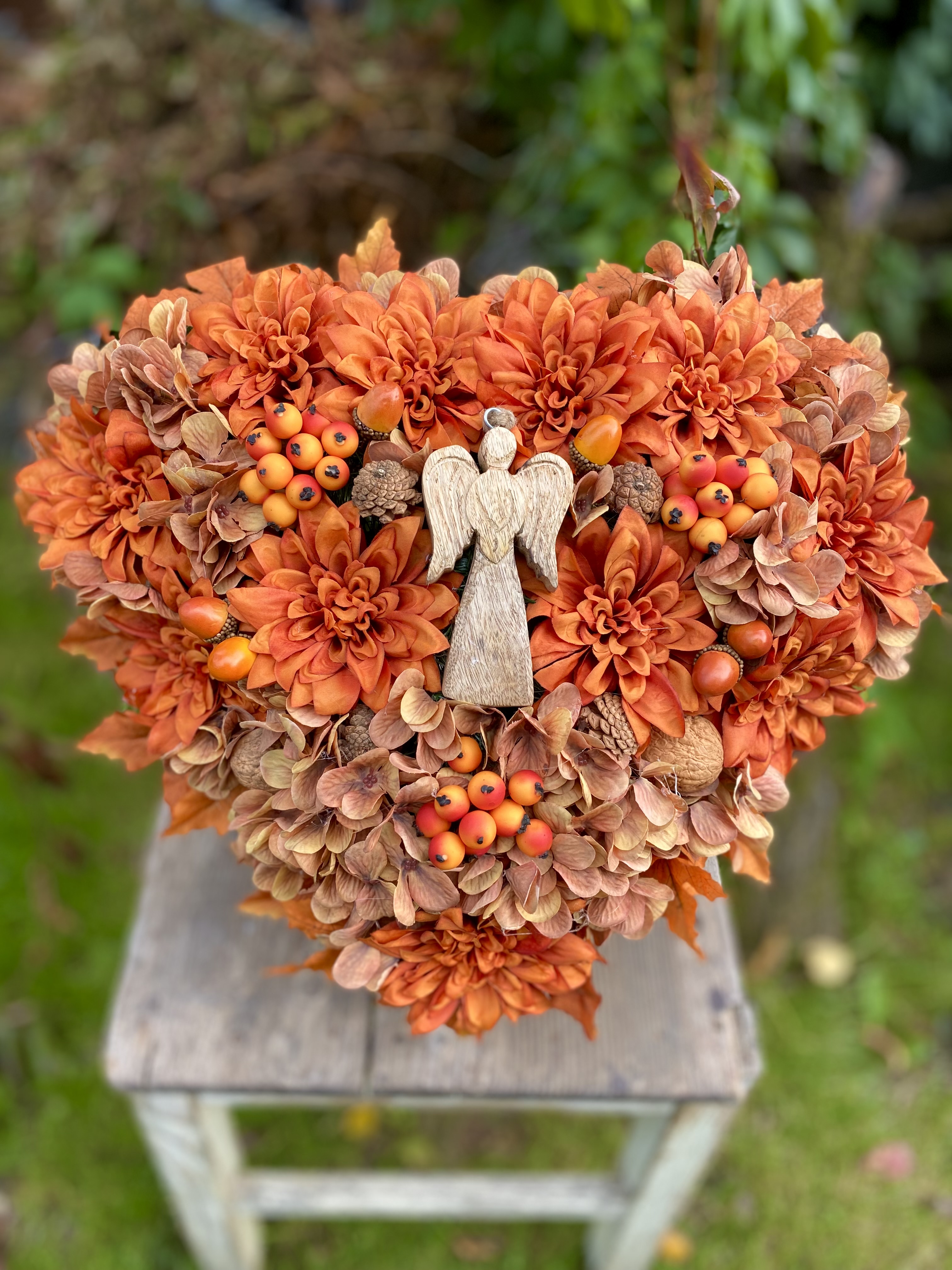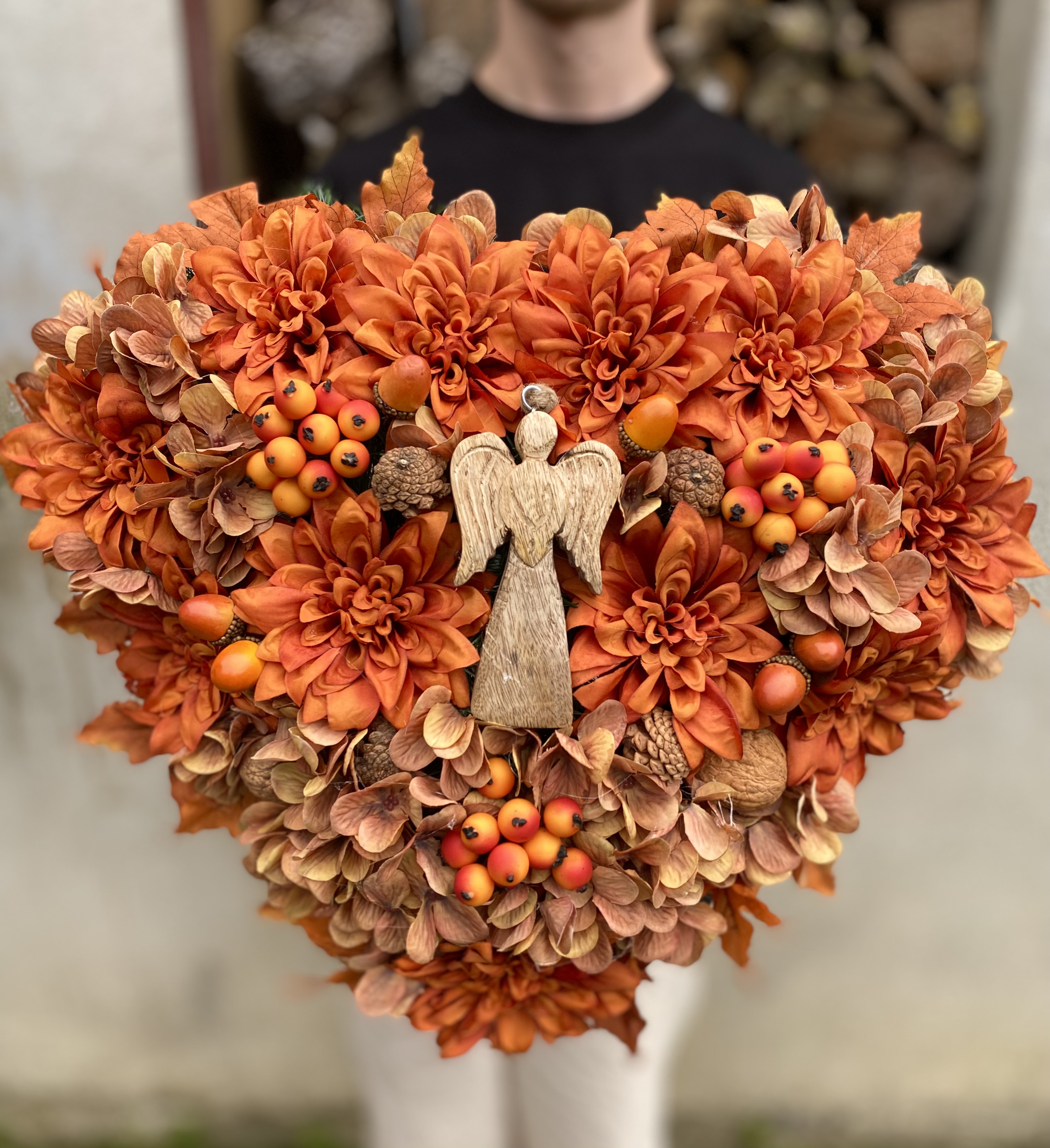 Elegantná dekorácia - jesenné srdce na hrob. Celok pôsobí dôstojne a prirodzene, symbolizuje lásku a spomienku, ktorá pretrváva aj v období jesene.