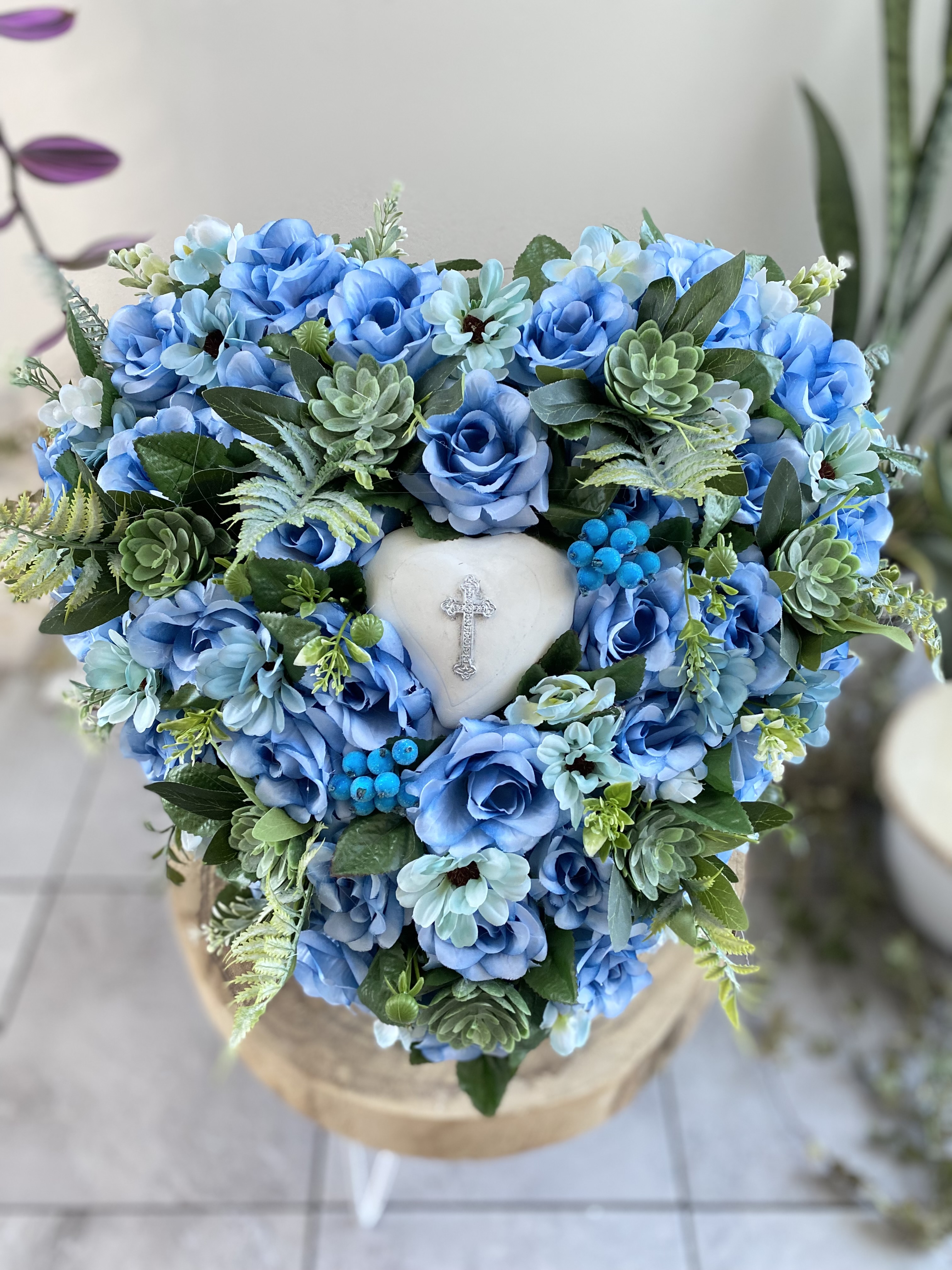 Elegantná kvetinová dekorácia v tvare srdca určená na hrobové miesto. Kombinácia modrých odtieňov, jemných kvetov a drobných bobuliek symbolizuje pokoj, lásku a spomienku.