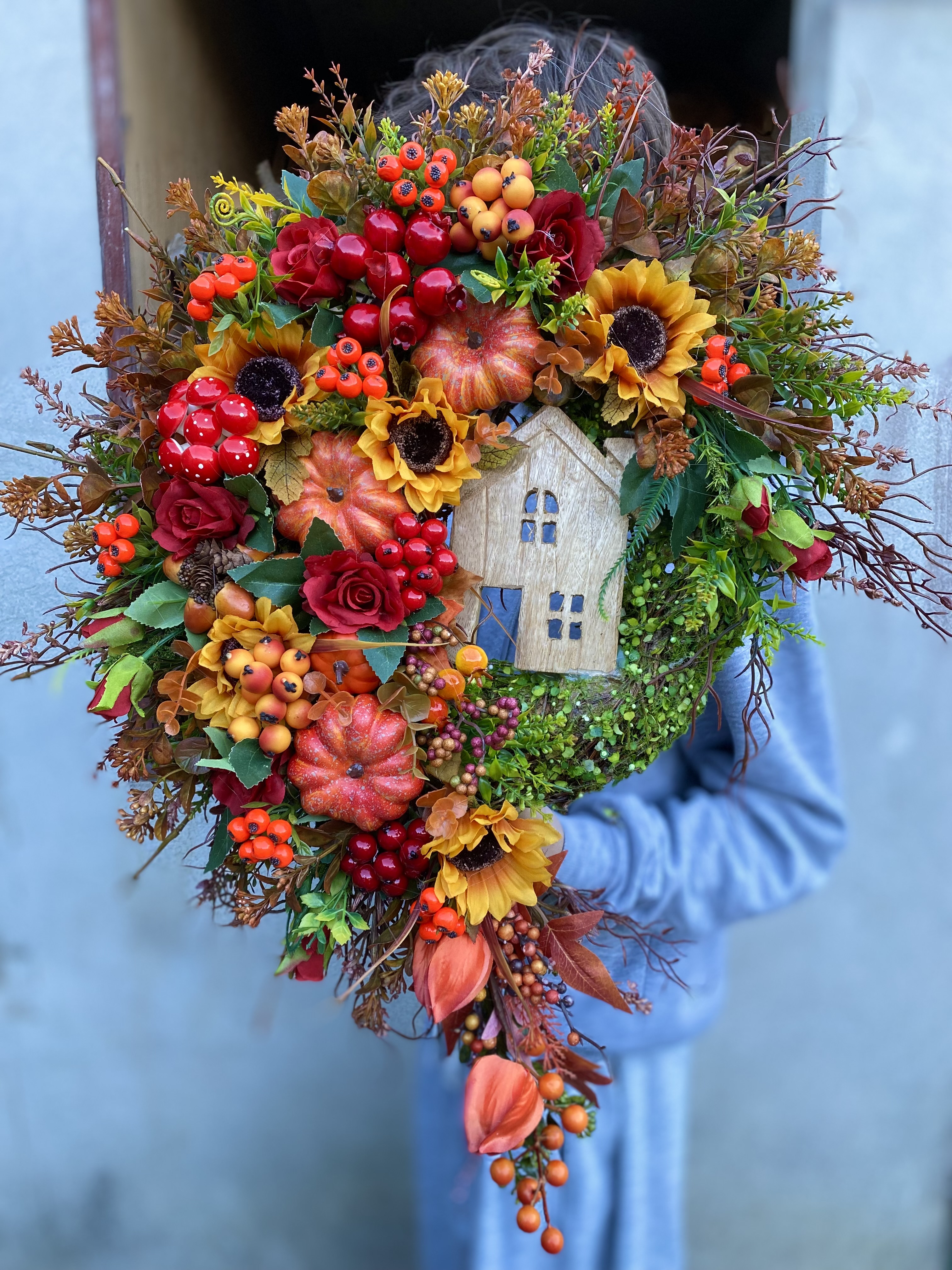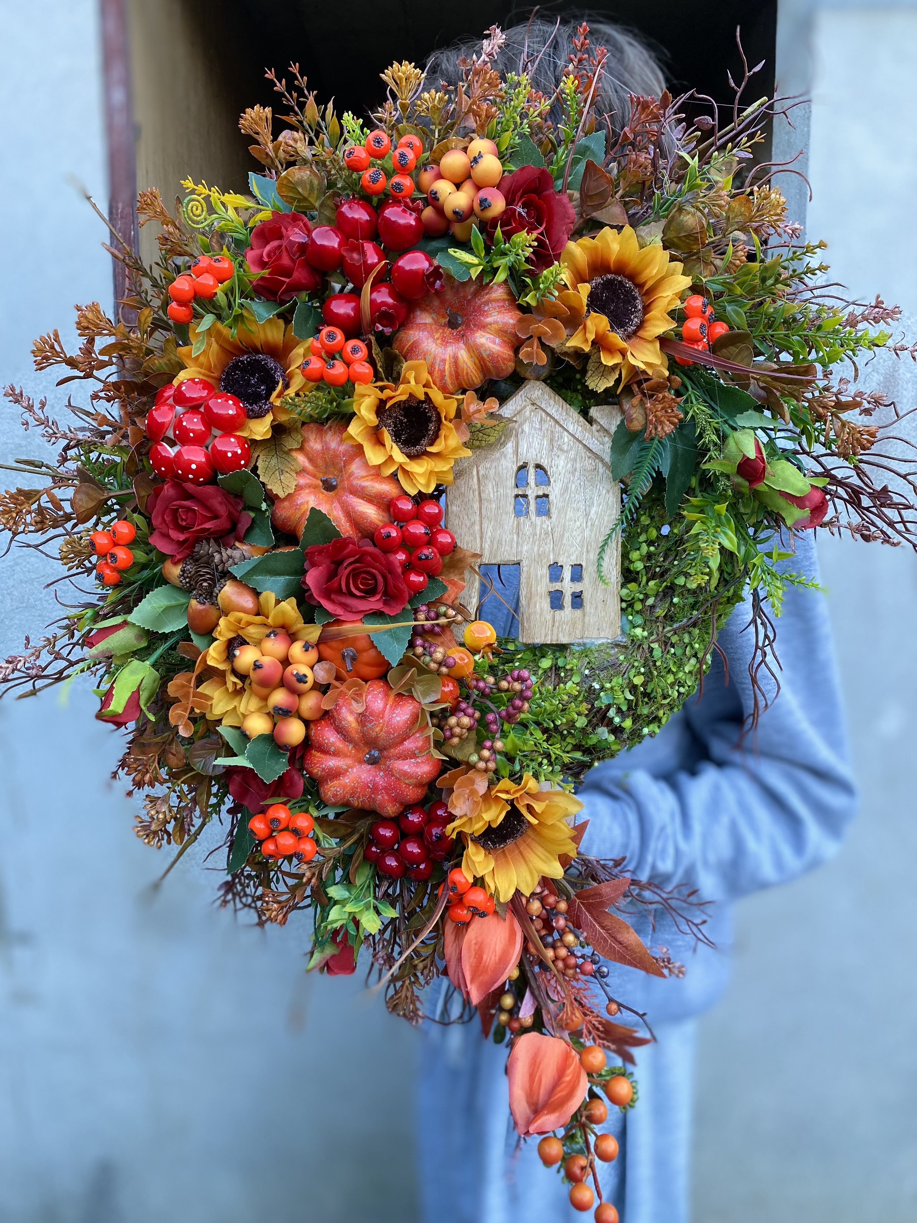 Tento originálny jesenný veniec s domčekom v sebe spája teplo domova a čaro jesennej prírody. Ručne aranžovaný veniec je ozdobený prvkami v odtieňoch jesene - plody,lístie, kvety, dekoratívny domček, ktorý symbolizuje pohodu a útulnosť.