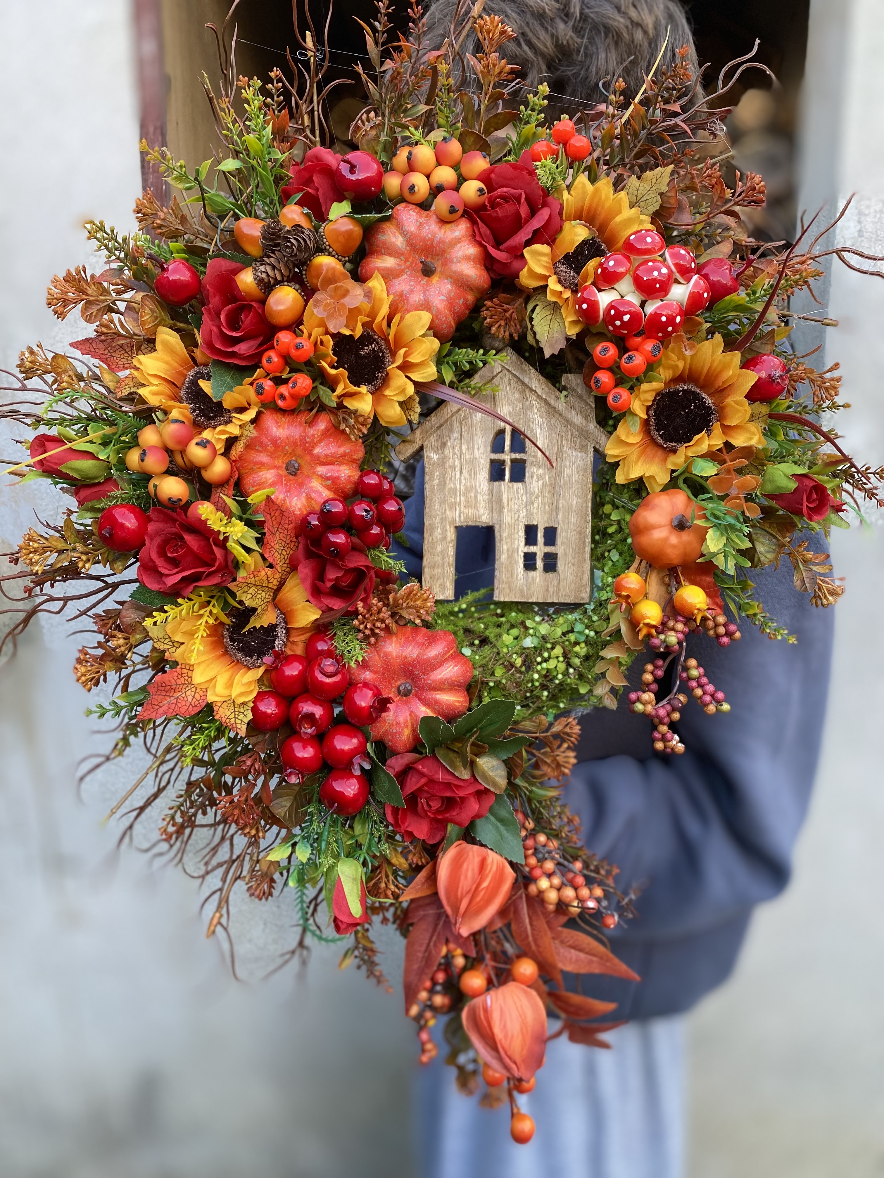 Tento originálny jesenný veniec s domčekom v sebe spája teplo domova a čaro jesennej prírody. Ručne aranžovaný veniec je ozdobený prvkami v odtieňoch jesene - plody,lístie, kvety, dekoratívny domček, ktorý symbolizuje pohodu a útulnosť.
