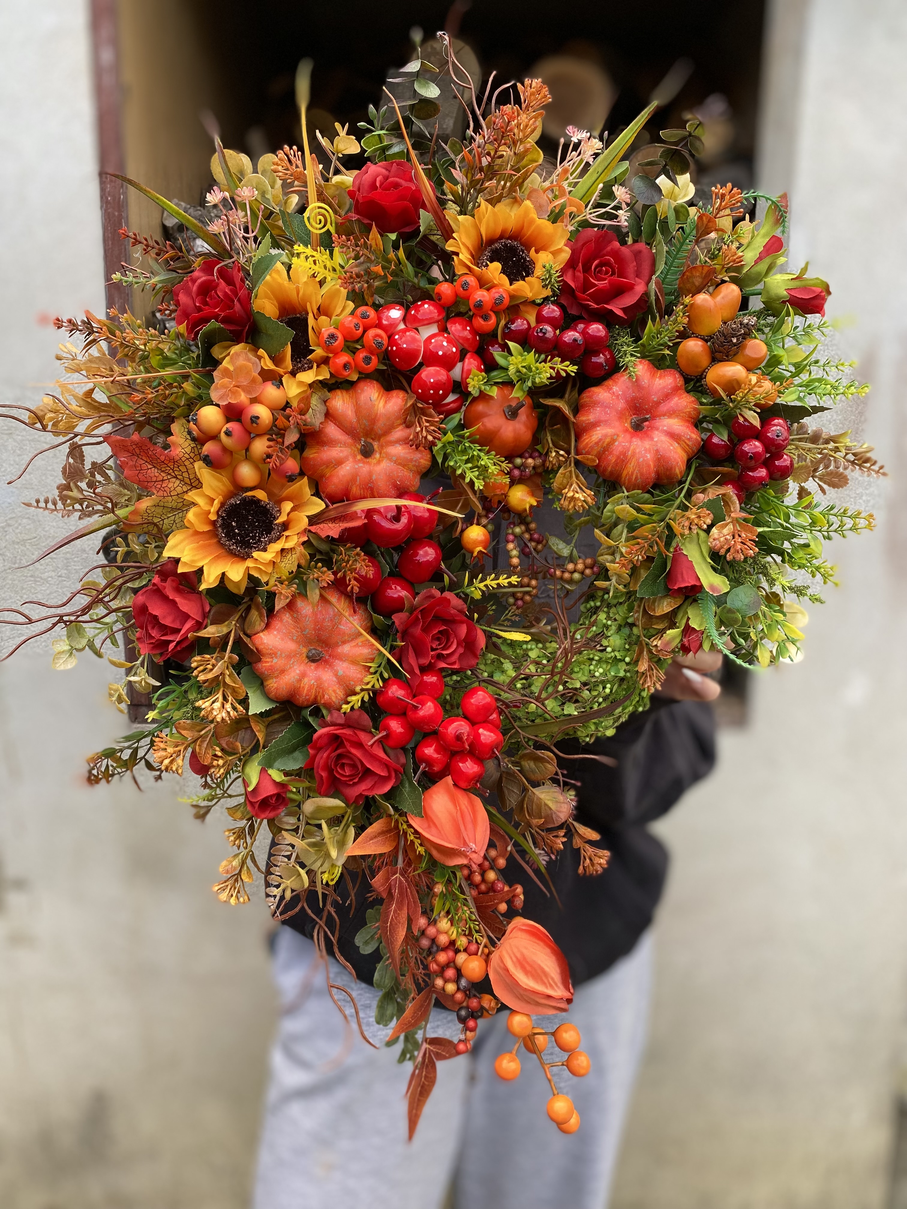 Veniec s tekvičkami priemer je cca 42cm previs cca 50cm.Použitý umelý materiál,prútie.
