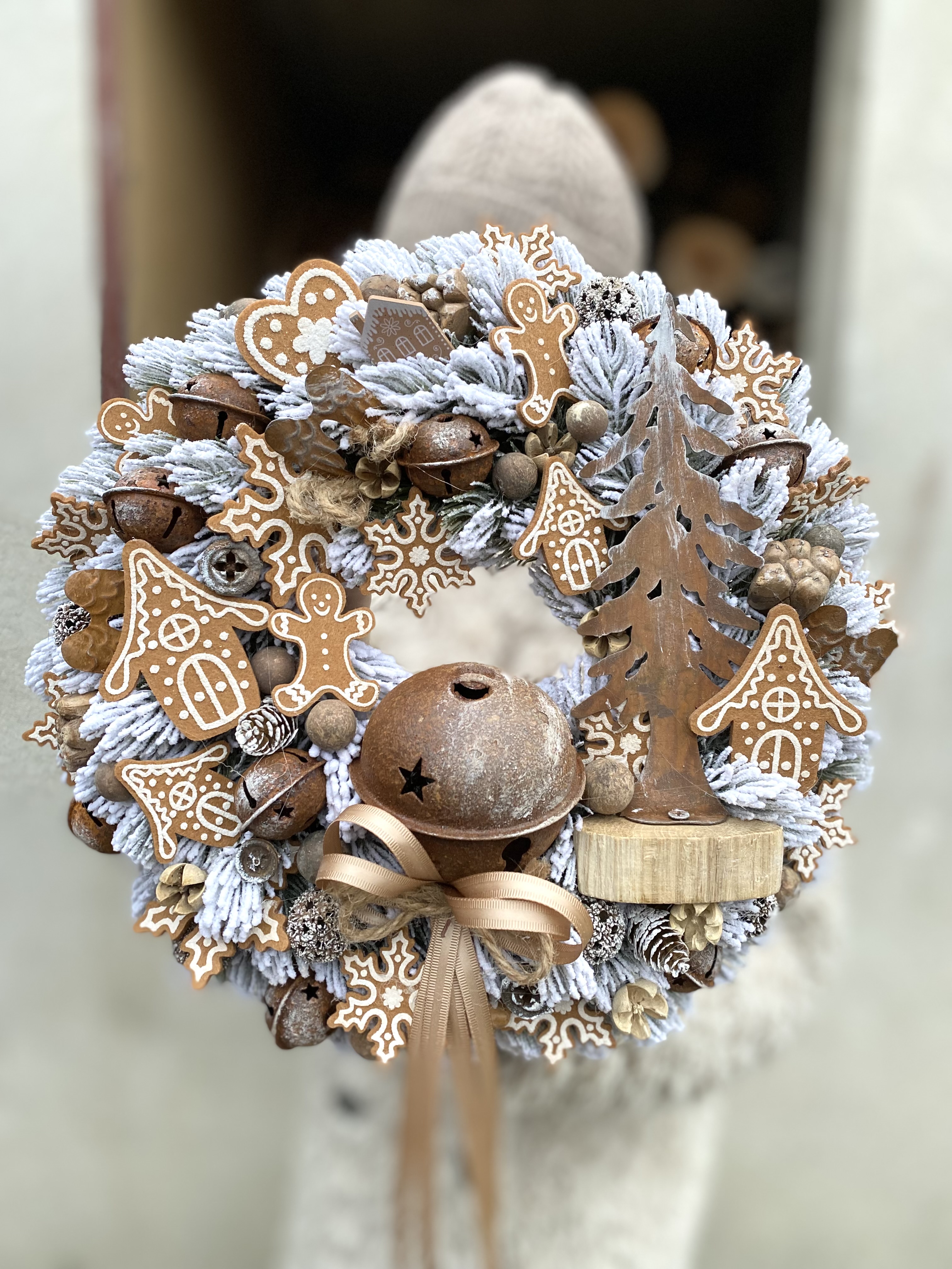 Zimný veniec na zavesenie s priemerom 35cm.Použitý umelý materiál, kov, flicové medovníky, sušina,