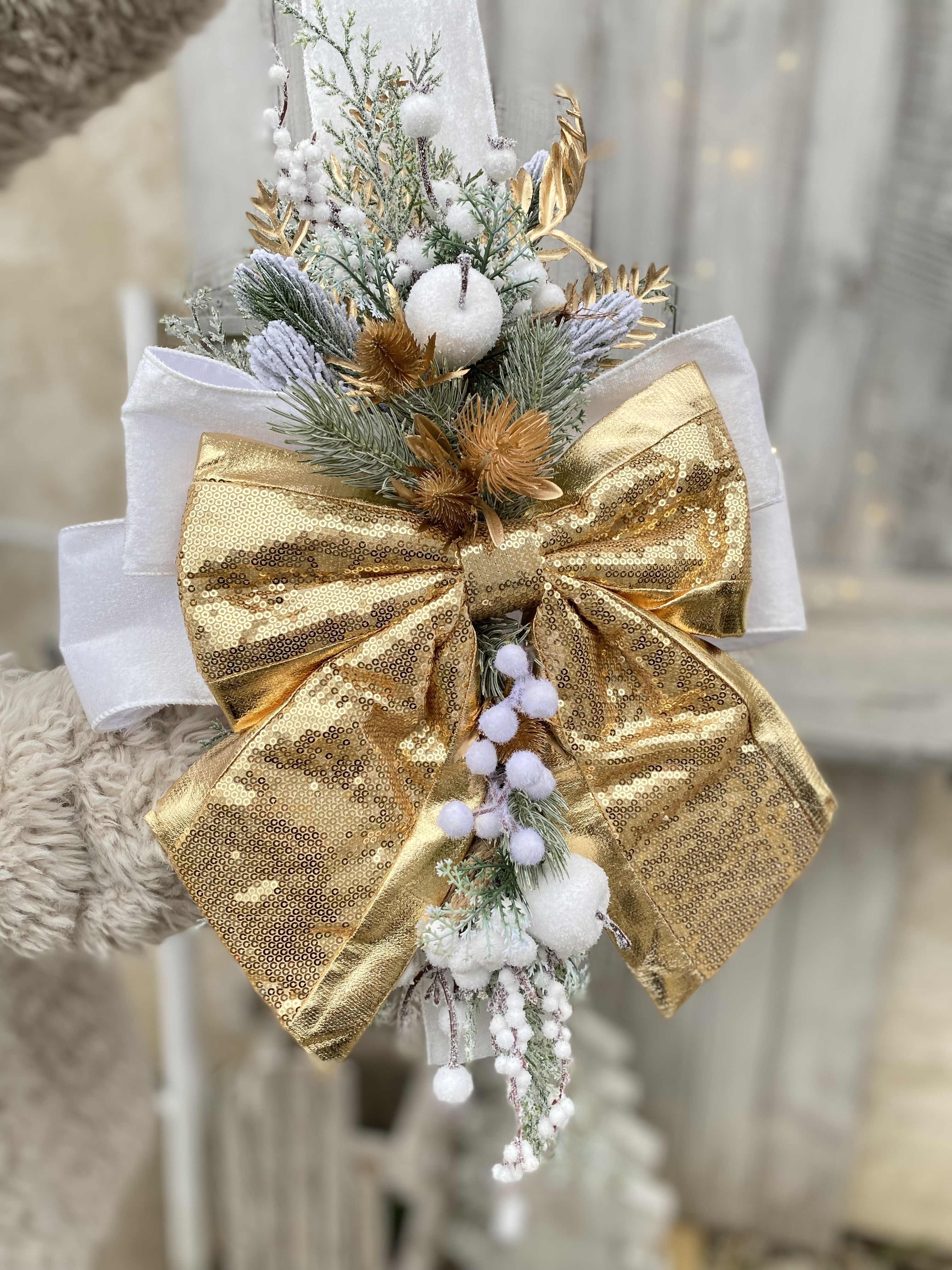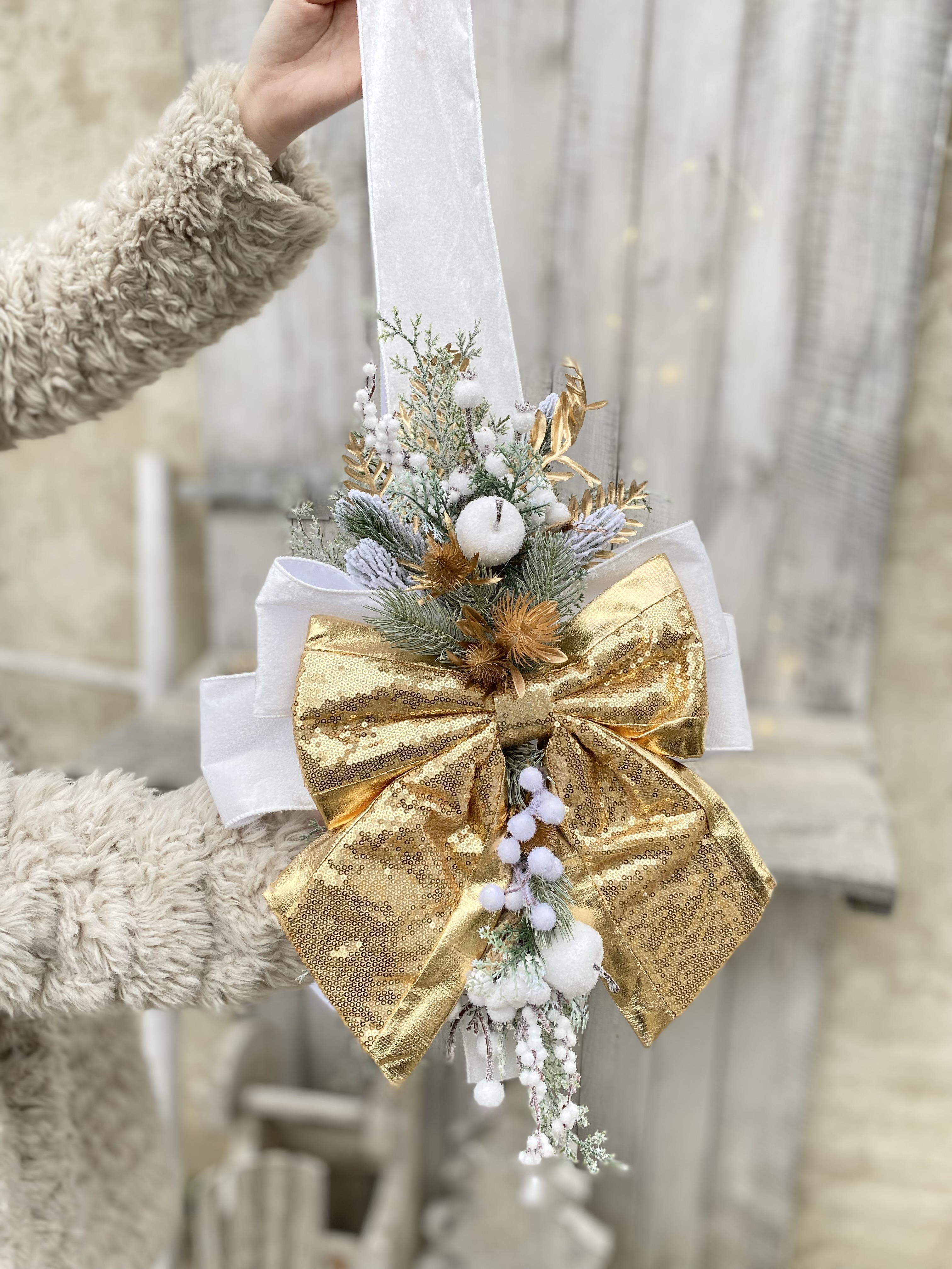 Dodajte svojim vchodovým dverám sviatočný lesk. Elegantná vianočná štóla v zlato bielej farbe vytvorí hrejivú, luxusnú atmosfeŕu a okamžite navodí pravú vianočnú náladu.