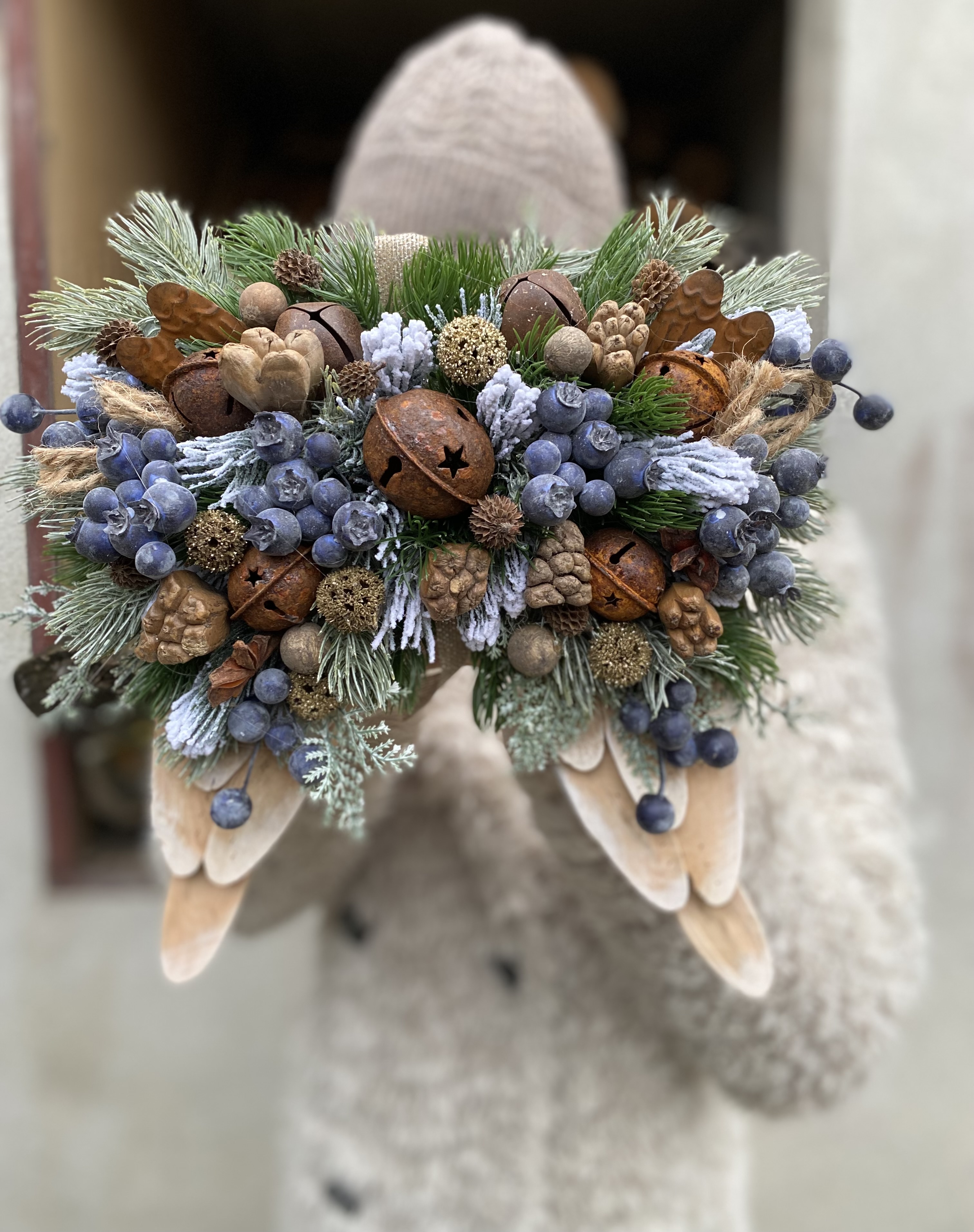 Zimné krídla na zavesenie rozmer cca 30x30cm.Použitý umelý materiál, kov, drevo, sušina,