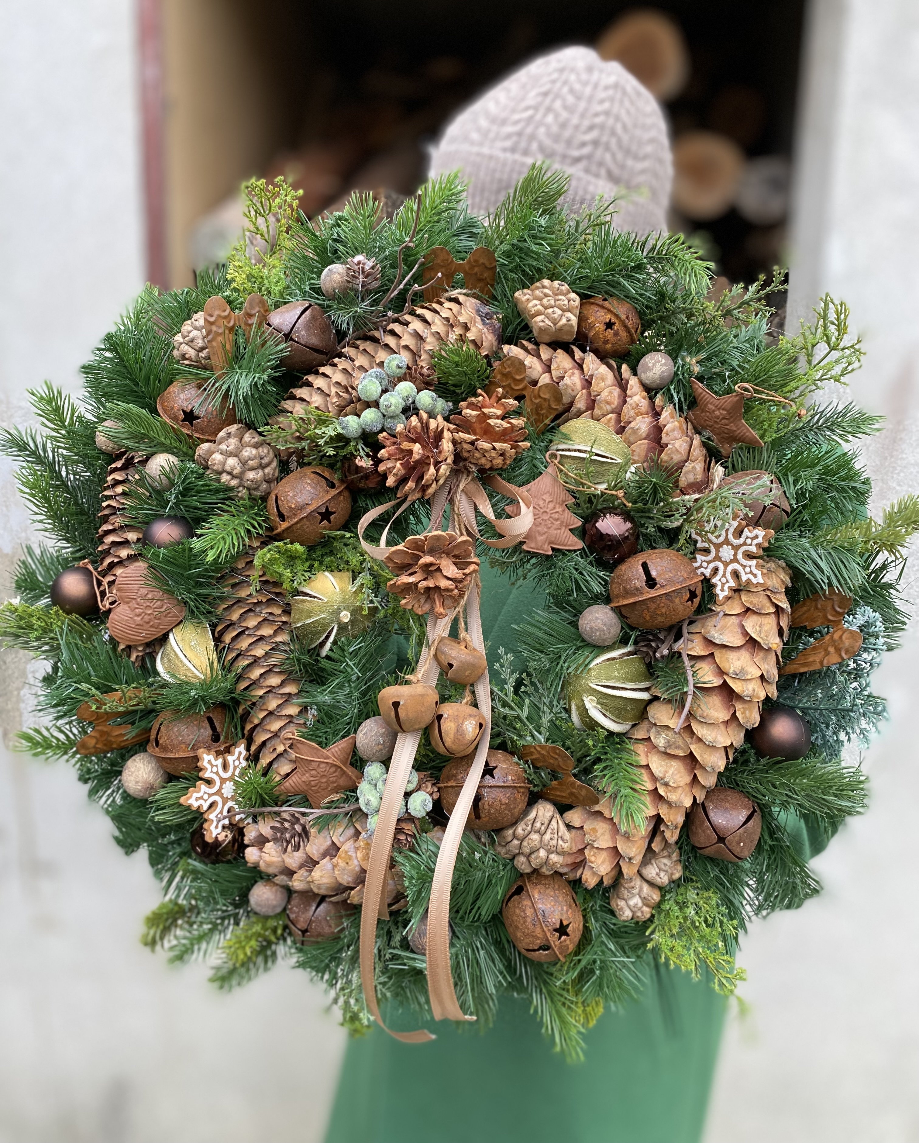 Zimný venec, v ktorom sa ukrýva tichá krása lesa. Šišky ako malé spomienky na prechádzky pod ihličím, hrdzavé doplnky ako stopy času, čo jemne pohládza kov. Tento veniec dýcha pokojom zimy - takým, ktorý neštípe, ale objíma. Je to kúsok lesa, ktorý sa usadil pri vašich dverách, aby pripomenul, že krása býva ukrytá v nenápadnosti.