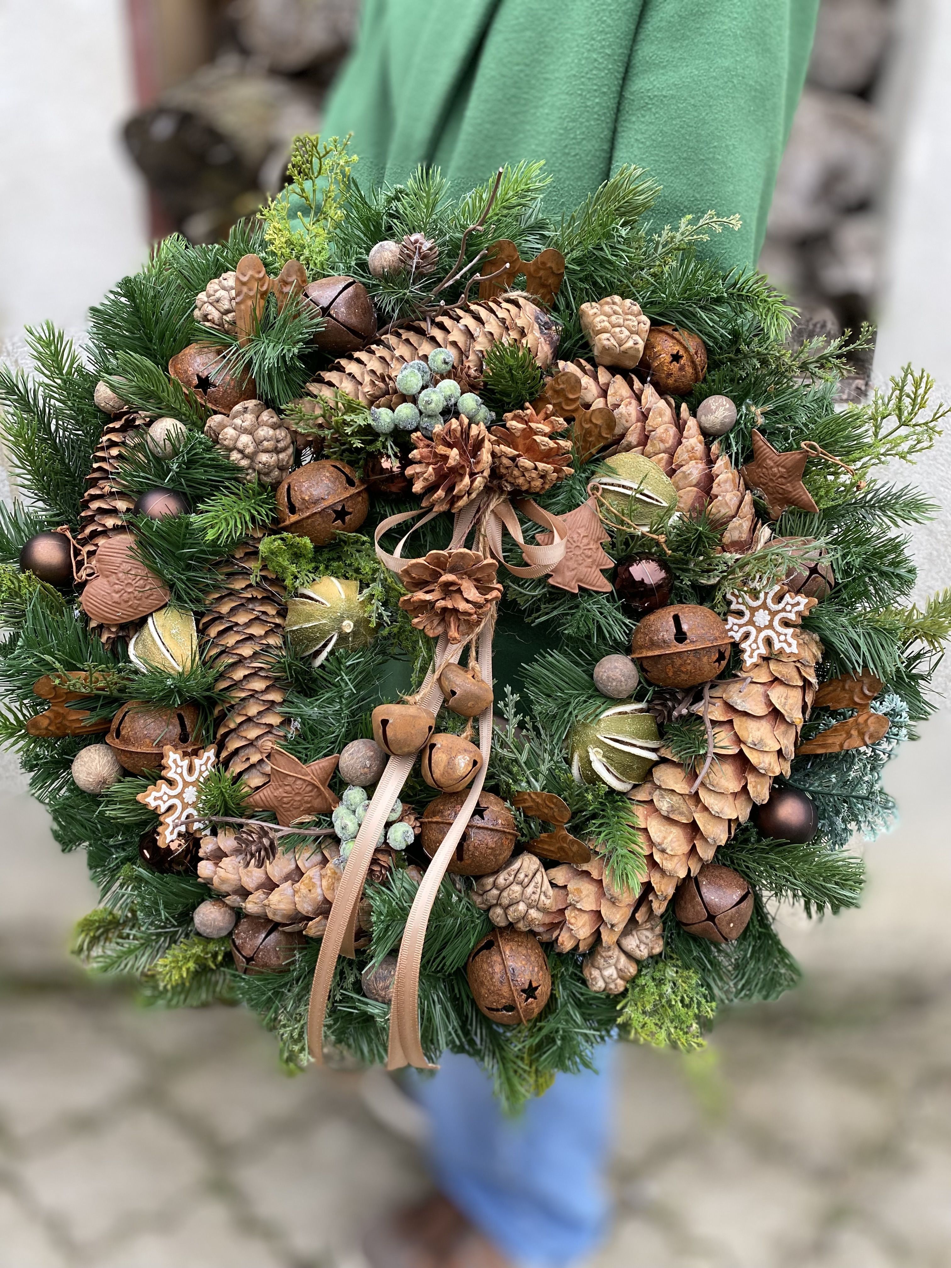 Zimný venec, v ktorom sa ukrýva tichá krása lesa. Šišky ako malé spomienky na prechádzky pod ihličím, hrdzavé doplnky ako stopy času, čo jemne pohládza kov. Tento veniec dýcha pokojom zimy - takým, ktorý neštípe, ale objíma. Je to kúsok lesa, ktorý sa usadil pri vašich dverách, aby pripomenul, že krása býva ukrytá v nenápadnosti.