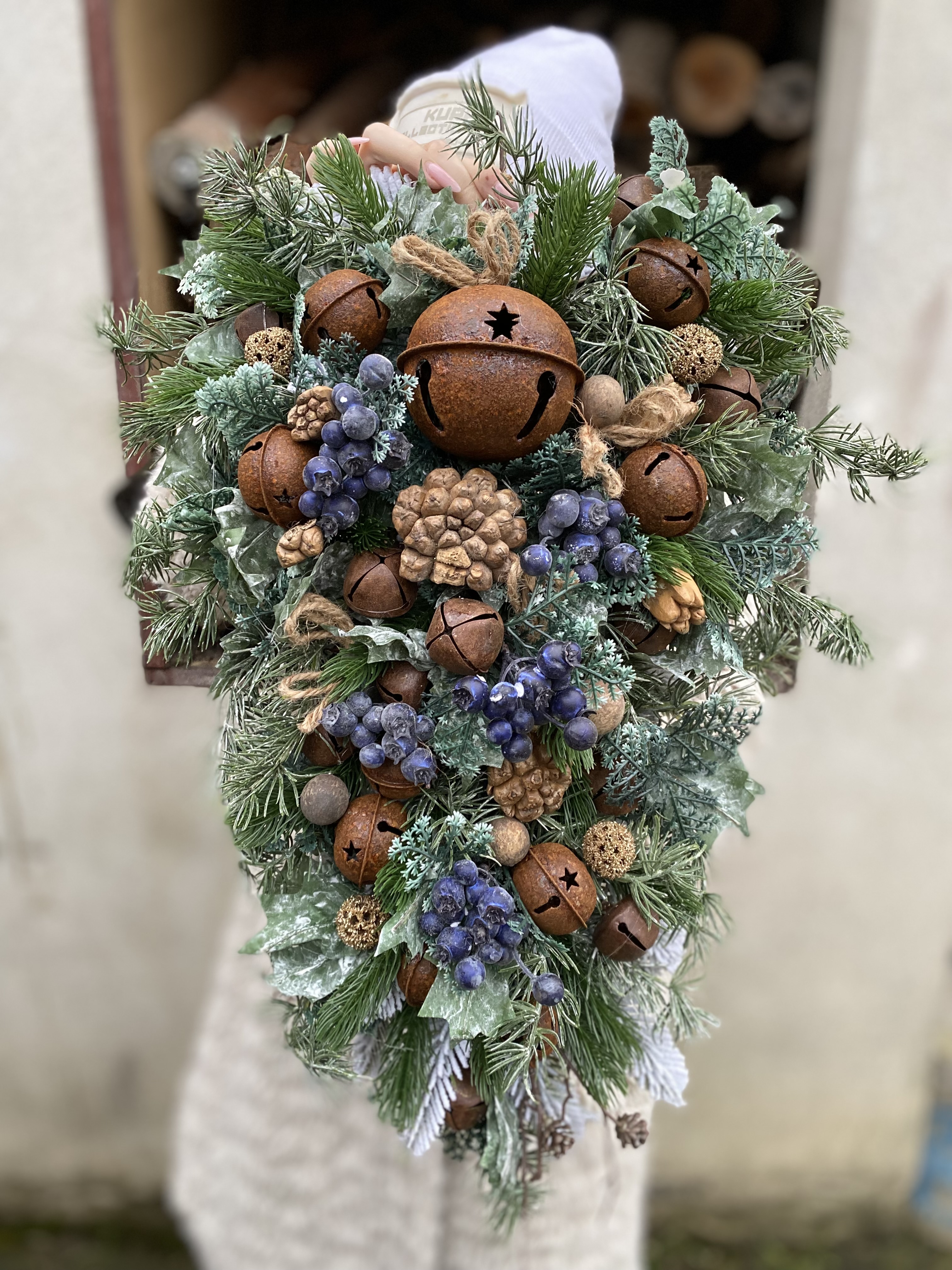 Zimný strapec s rolničkami a bobuľakmi. Kombinácia prírodneho vzhľadu bobuliek, kovových rolničiek prináša šarm rustikálnych Vianoc a pôsobí hrejivo aj v najchladnejších dňoch.