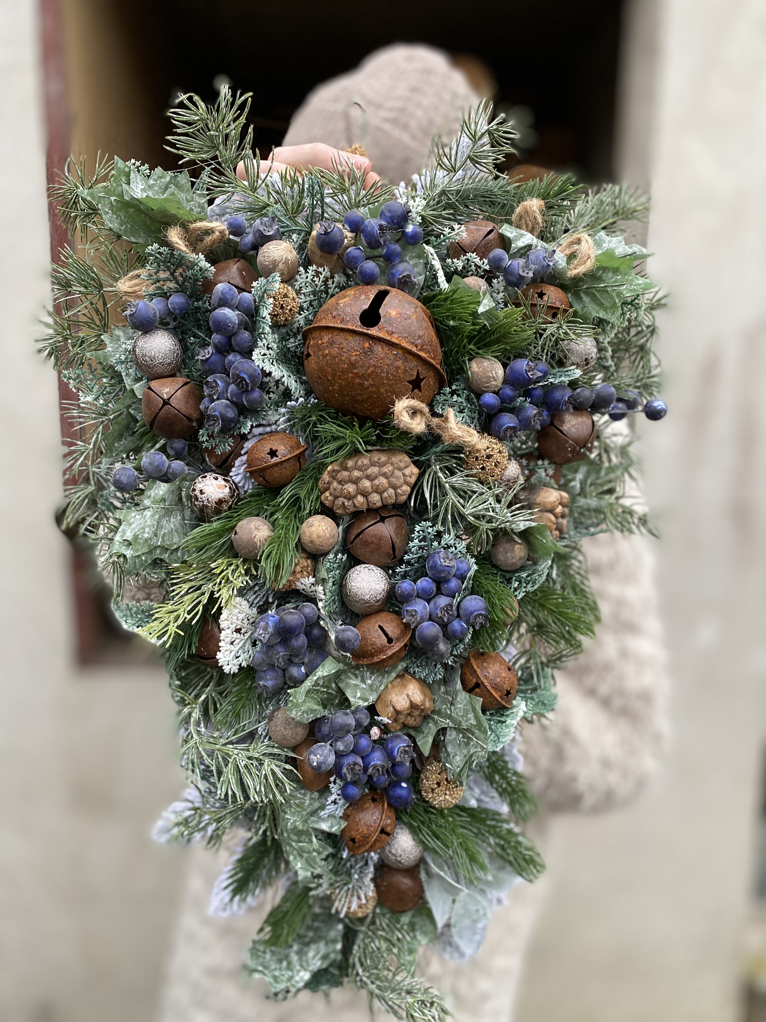 Zimný strapec s rolničkami a bobuľakmi. Kombinácia prírodneho vzhľadu bobuliek, kovových rolničiek prináša šarm rustikálnych Vianoc a pôsobí hrejivo aj v najchladnejších dňoch.
