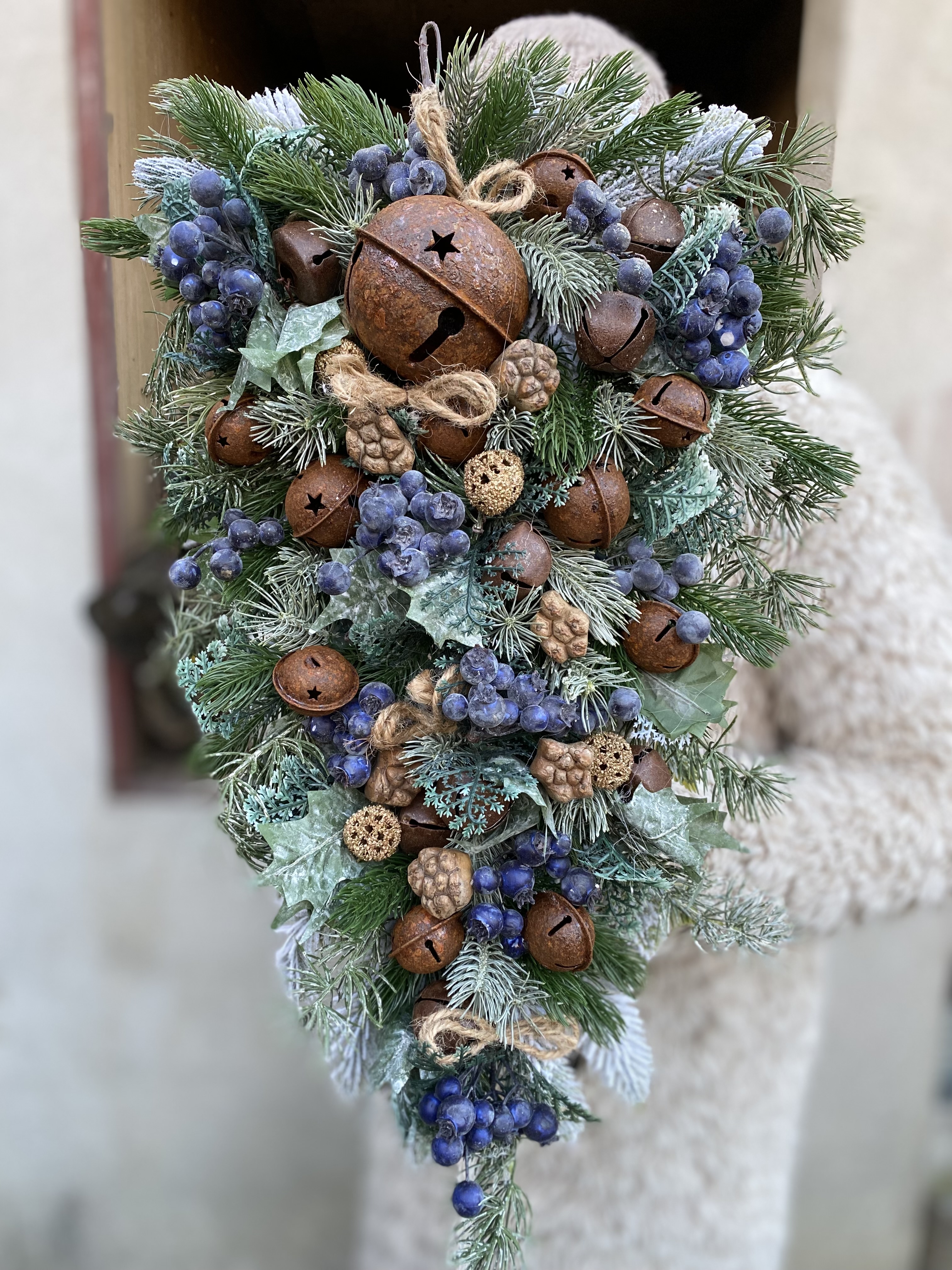 Zimný strapec s rolničkami a bobuľakmi. Kombinácia prírodneho vzhľadu bobuliek, kovových rolničiek prináša šarm rustikálnych Vianoc a pôsobí hrejivo aj v najchladnejších dňoch.