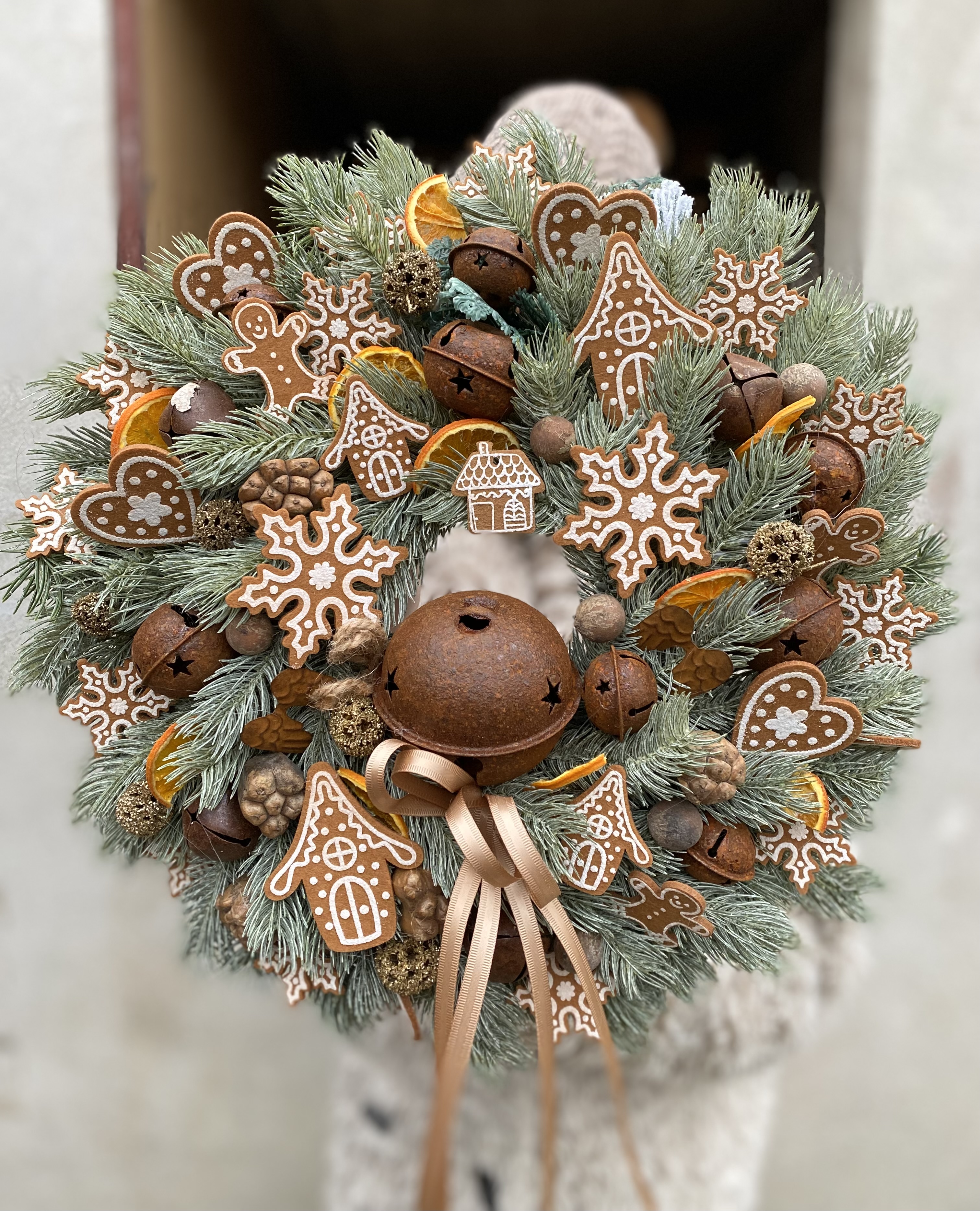 Zimný veniec s medovníčkami a rolničkami. Priemer je 42cm. Použitý umelý materiál, sušina, stuha