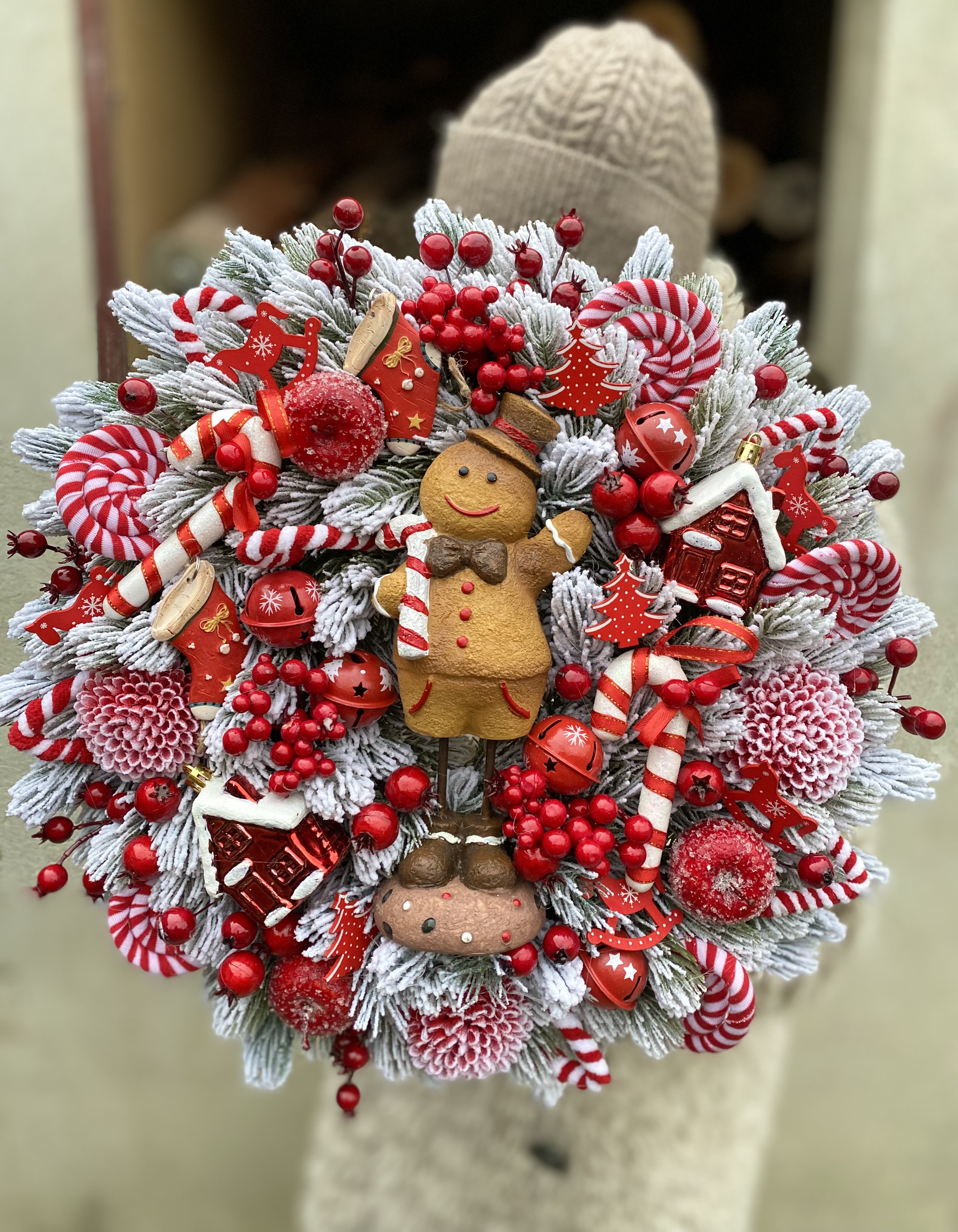 Zimný veniec s medovníčkom. Priemer je 42cm. Použitý umelý materiál, polyresin.