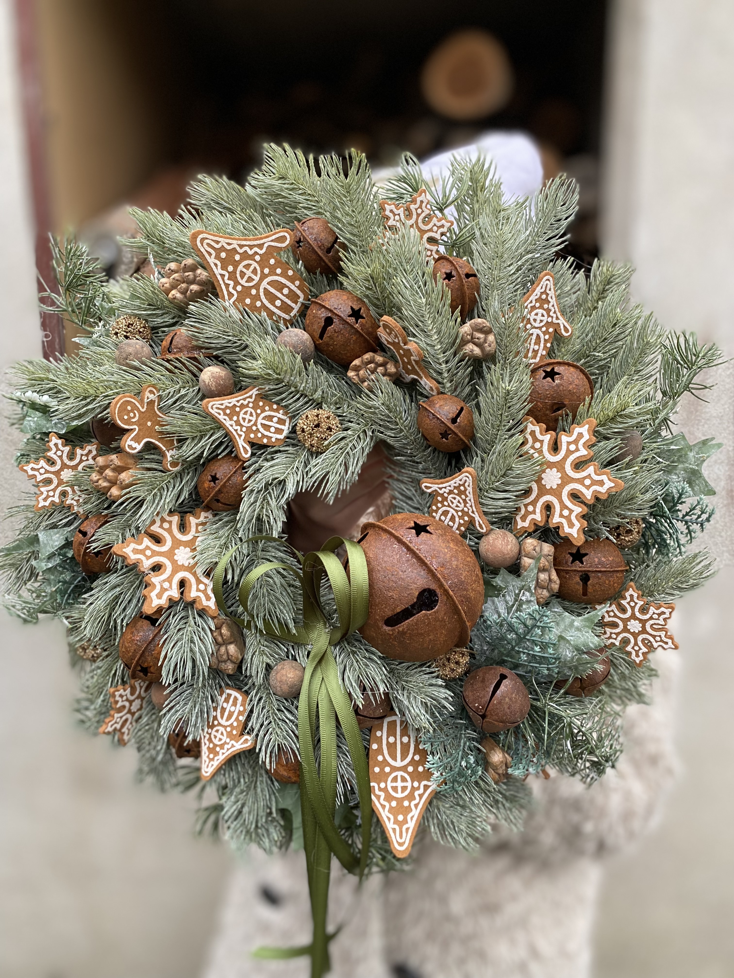 Zimný veniec s medovníčkami a rolničkami. Priemer je 45cm.Použitý umelý materiál, kov, stuha,