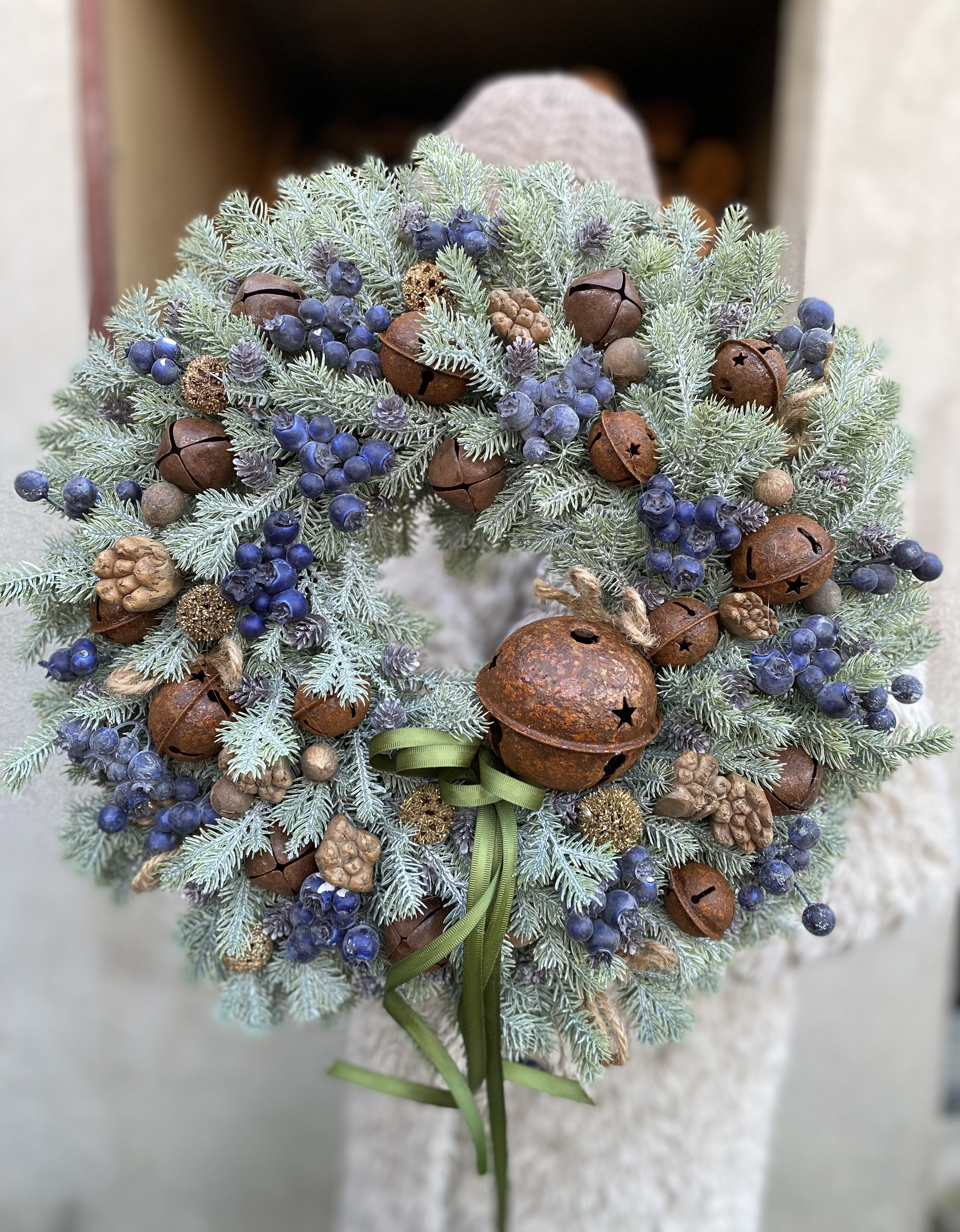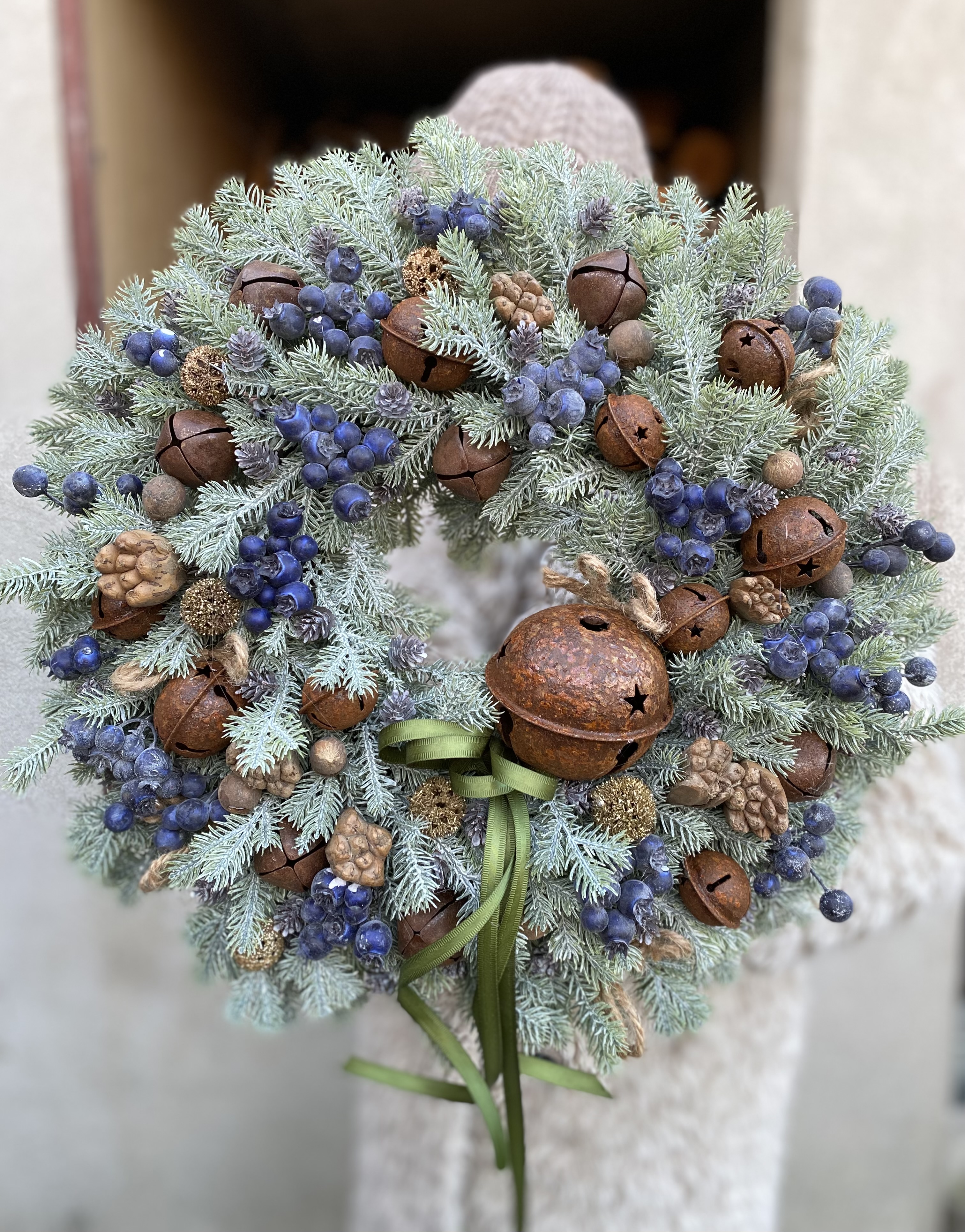 Vianočný veniec s fialovými bobuľkami  dodávajú vencu štipku nóblesy, zatiaľ čo hrdzavé rolničky prinášajú nostalgický dotyk tradičných Vianoc.