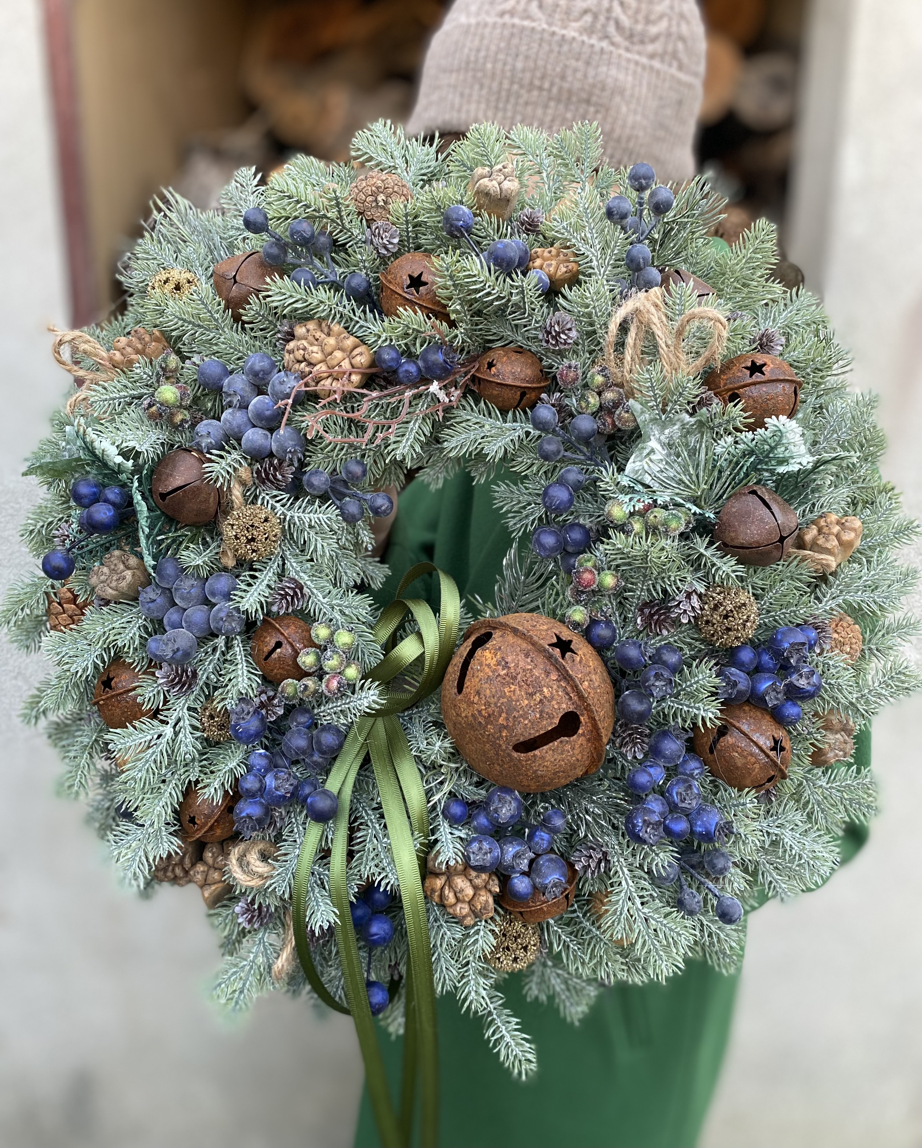 Vianočný veniec s fialovými bobuľkami  dodávajú vencu štipku nóblesy, zatiaľ čo hrdzavé rolničky prinášajú nostalgický dotyk tradičných Vianoc.