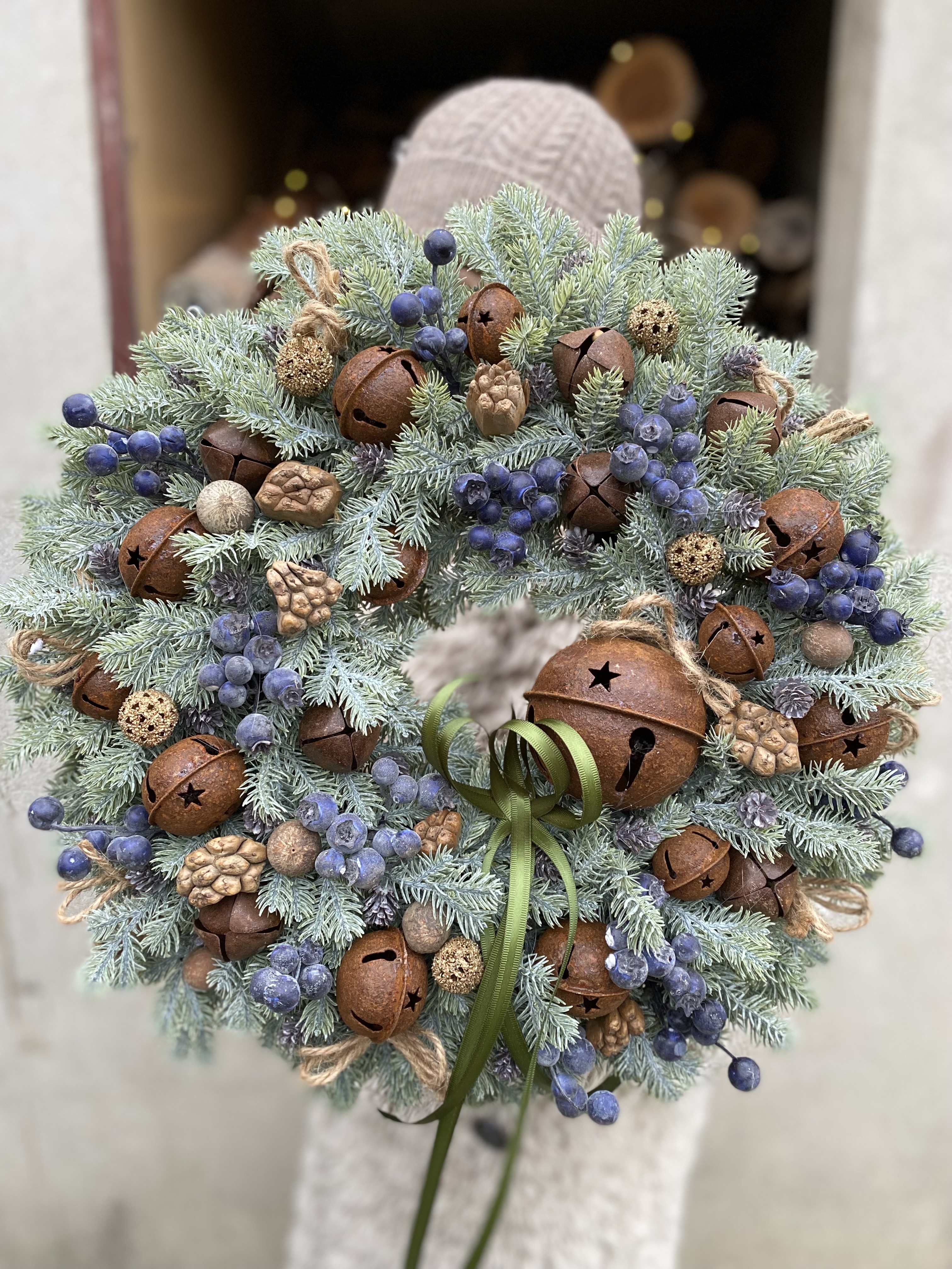 Vianočný veniec s fialovými bobuľkami  dodávajú vencu štipku nóblesy, zatiaľ čo hrdzavé rolničky prinášajú nostalgický dotyk tradičných Vianoc.
