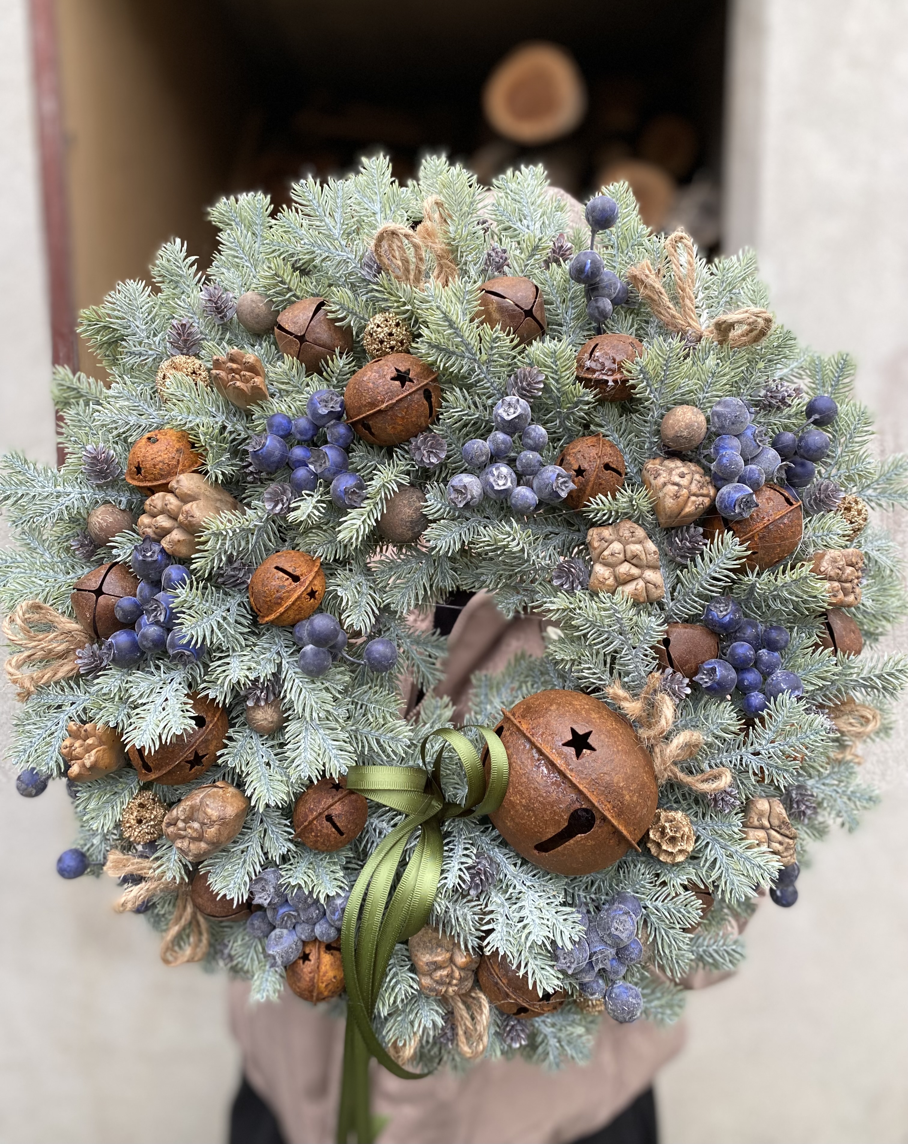 Vianočný veniec s fialovými bobuľkami  dodávajú vencu štipku nóblesy, zatiaľ čo hrdzavé rolničky prinášajú nostalgický dotyk tradičných Vianoc.